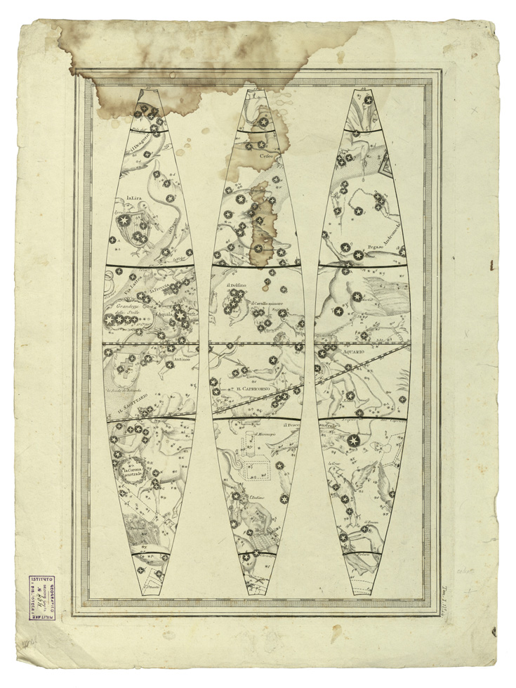 "...CALCOLATO PER IL CORRENTE ANNO SULLE OSSERVAZIONI DE' SIGG. FLAMSTEED, E DE LA CAILLE. ROMA PRESSO LA CALC.A CAM.LE 1792 INCISO DAL P. GIO M.A CASSINI C.R.S. "GLOBI DELINEATI DAL PADRE GIOVANNI MARIA CASSINI CHIERICO REGOLARE SOMASCO" costruiti per la Biblioteca dell' I.G.M. nell'anno 1928. Il materiale per formare i Globi è stato tracciato dal Cassini, che fu geografo, cartografo e intagliatore su rame. Al numero d'ordine 44 del catalogo è la descrizione del Testo: "INTRODUZIONE GENERALE ALLO STUDIO DELLA GEOGRAFIA" e del "NUOVO ATLANTE GEOGRAFICO UNIVERSALE IN TRE TOMI", editi fra gli anni 1792-1801, contenenti complessivamente 182 tavole artisticamente incise. Le tavole 7, 8, 9, 10, 15 e 17 del tomo I contengono i disegni per formare il GLOBO TERRESTRE. A costruire il GLOBO CELESTE sono servite le tavole 11, 12, 13, 14, 16 e 18 dello stesso tomo I. La periferia dei 12 spicchi è metri 1,06 in ambi i disegni altre caratteristiche comuni alle due sfere sono: linea equatoriale, tropici, eclittica, ampiezza degli spicchi all'equatore 30°. Il Globo terrestre è del 1843, ma prima di tale data esso subì delle varianti, concretate dopo accrescimenti per nuove scoperte geografiche e conseguenti rettifiche, nella attuale rappresentazione. I meridiani sono tracciati, come i paralleli, ogni 10°. Il meridiano iniziale, che passa per l'Isola del Ferro, l'equatore e l'eclittica, sono divisi in gradi. Il sostegno, o castello, è in legno tornito a quattro colonnine presenta sull'orizzonte incollata una carta colle indicazioni dei segni dello zodiaco, delle rose dei venti, e con la divisione di grado in grado. Una tabellina offre la lunghezza del grado del circolo massimo della Sfera terrestre in 14 diverse unità di misura. Il Globo celeste contiene le costellazioni, la via lattea, le stelle fino alla 6^ grandezza e le nebulose è calcolato per l'anno 1792 sui dati degli astronomi "Flamsteed e De la Caille". E' rivestito con spicchi come il Globo terrestre. Le due Sfere ruotano attorno un asse di acciaio che passa per i poli i sostegni sono eguali nei due Globi. "NUOVO ATLANTE GEOGRAFICO UNIVERSALE IN TRE TOMI", pubblicato in Roma presso la Calcografia Camerale, opera diretta per l'incisione da Padre G. M. Cassini. Il tomo I è dell'anno 1792, consta di carte 55 precedute da bella allegoria ideata da Tofanelli, incisa da Alessandro Mochetti. Il tomo II è dell'anno 1797, consta di carte 70, precedute da altra allegoria ideata e incisa da Demetrio Dragon. Il tomo III è dell'anno 1801, consta di 57 carte precedute da allegoria di Demetrio Dragon (come nel tomo II). L'opera grandiosa è stata favorita da Papa Pio VI. Redattore, specialmente del tomo I, è il Canonico D. Pietro Bonaccorsi. Del documento fanno parte un testo ed i globi. Testo: "INTRODUZIONE GENERALE ALLO STUDIO DELLA GEOGRAFIA" compendiosa notizia di pagine 34 stampata a Roma nella Calcografia Camerale, divisa in cinque parti: (1792-1801). Parte 1) della Sfera e de' due Globi celeste e terrestre. Parte 2) de' termini generali della Geografia. Parte 3) dell'origine, progressi e stato attuale della medesima. Parte 4) del metodo tenuto per il presente Atlante. Parte 5) delle navigazioni degli antichi fino a noi, e delle scoperte onde per loro mezzo si è arricchita la geografia. Di quest'opera si posseggono due copie, una è mancante del titolo."