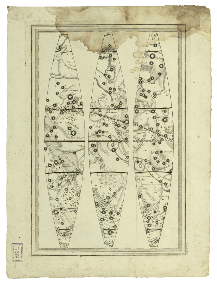"...CALCOLATO PER IL CORRENTE ANNO SULLE OSSERVAZIONI DE' SIGG. FLAMSTEED, E DE LA CAILLE. ROMA PRESSO LA CALC.A CAM.LE 1792 INCISO DAL P. GIO M.A CASSINI C.R.S. "GLOBI DELINEATI DAL PADRE GIOVANNI MARIA CASSINI CHIERICO REGOLARE SOMASCO" costruiti per la Biblioteca dell' I.G.M. nell'anno 1928. Il materiale per formare i Globi è stato tracciato dal Cassini, che fu geografo, cartografo e intagliatore su rame. Al numero d'ordine 44 del catalogo è la descrizione del Testo: "INTRODUZIONE GENERALE ALLO STUDIO DELLA GEOGRAFIA" e del "NUOVO ATLANTE GEOGRAFICO UNIVERSALE IN TRE TOMI", editi fra gli anni 1792-1801, contenenti complessivamente 182 tavole artisticamente incise. Le tavole 7, 8, 9, 10, 15 e 17 del tomo I contengono i disegni per formare il GLOBO TERRESTRE. A costruire il GLOBO CELESTE sono servite le tavole 11, 12, 13, 14, 16 e 18 dello stesso tomo I. La periferia dei 12 spicchi è metri 1,06 in ambi i disegni altre caratteristiche comuni alle due sfere sono: linea equatoriale, tropici, eclittica, ampiezza degli spicchi all'equatore 30°. Il Globo terrestre è del 1843, ma prima di tale data esso subì delle varianti, concretate dopo accrescimenti per nuove scoperte geografiche e conseguenti rettifiche, nella attuale rappresentazione. I meridiani sono tracciati, come i paralleli, ogni 10°. Il meridiano iniziale, che passa per l'Isola del Ferro, l'equatore e l'eclittica, sono divisi in gradi. Il sostegno, o castello, è in legno tornito a quattro colonnine presenta sull'orizzonte incollata una carta colle indicazioni dei segni dello zodiaco, delle rose dei venti, e con la divisione di grado in grado. Una tabellina offre la lunghezza del grado del circolo massimo della Sfera terrestre in 14 diverse unità di misura. Il Globo celeste contiene le costellazioni, la via lattea, le stelle fino alla 6^ grandezza e le nebulose è calcolato per l'anno 1792 sui dati degli astronomi "Flamsteed e De la Caille". E' rivestito con spicchi come il Globo terrestre. Le due Sfere ruotano attorno un asse di acciaio che passa per i poli i sostegni sono eguali nei due Globi. "NUOVO ATLANTE GEOGRAFICO UNIVERSALE IN TRE TOMI", pubblicato in Roma presso la Calcografia Camerale, opera diretta per l'incisione da Padre G. M. Cassini. Il tomo I è dell'anno 1792, consta di carte 55 precedute da bella allegoria ideata da Tofanelli, incisa da Alessandro Mochetti. Il tomo II è dell'anno 1797, consta di carte 70, precedute da altra allegoria ideata e incisa da Demetrio Dragon. Il tomo III è dell'anno 1801, consta di 57 carte precedute da allegoria di Demetrio Dragon (come nel tomo II). L'opera grandiosa è stata favorita da Papa Pio VI. Redattore, specialmente del tomo I, è il Canonico D. Pietro Bonaccorsi. Del documento fanno parte un testo ed i globi. Testo: "INTRODUZIONE GENERALE ALLO STUDIO DELLA GEOGRAFIA" compendiosa notizia di pagine 34 stampata a Roma nella Calcografia Camerale, divisa in cinque parti: (1792-1801). Parte 1) della Sfera e de' due Globi celeste e terrestre. Parte 2) de' termini generali della Geografia. Parte 3) dell'origine, progressi e stato attuale della medesima. Parte 4) del metodo tenuto per il presente Atlante. Parte 5) delle navigazioni degli antichi fino a noi, e delle scoperte onde per loro mezzo si è arricchita la geografia. Di quest'opera si posseggono due copie, una è mancante del titolo."
