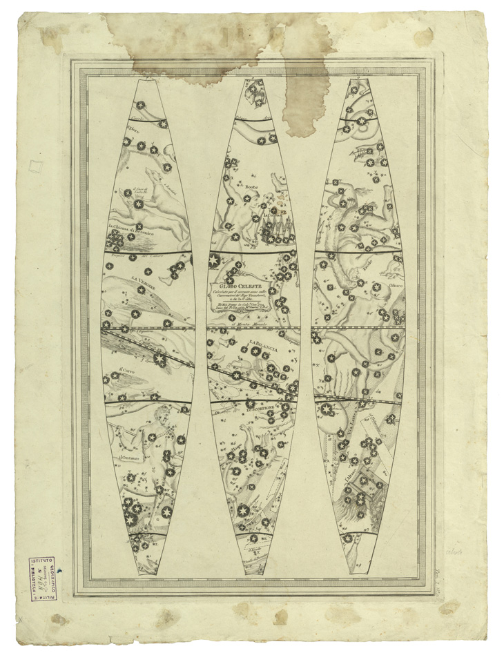 "...CALCOLATO PER IL CORRENTE ANNO SULLE OSSERVAZIONI DE' SIGG. FLAMSTEED, E DE LA CAILLE. ROMA PRESSO LA CALC.A CAM.LE 1792 INCISO DAL P. GIO M.A CASSINI C.R.S. "GLOBI DELINEATI DAL PADRE GIOVANNI MARIA CASSINI CHIERICO REGOLARE SOMASCO" costruiti per la Biblioteca dell' I.G.M. nell'anno 1928. Il materiale per formare i Globi è stato tracciato dal Cassini, che fu geografo, cartografo e intagliatore su rame. Al numero d'ordine 44 del catalogo è la descrizione del Testo: "INTRODUZIONE GENERALE ALLO STUDIO DELLA GEOGRAFIA" e del "NUOVO ATLANTE GEOGRAFICO UNIVERSALE IN TRE TOMI", editi fra gli anni 1792-1801, contenenti complessivamente 182 tavole artisticamente incise. Le tavole 7, 8, 9, 10, 15 e 17 del tomo I contengono i disegni per formare il GLOBO TERRESTRE. A costruire il GLOBO CELESTE sono servite le tavole 11, 12, 13, 14, 16 e 18 dello stesso tomo I. La periferia dei 12 spicchi è metri 1,06 in ambi i disegni altre caratteristiche comuni alle due sfere sono: linea equatoriale, tropici, eclittica, ampiezza degli spicchi all'equatore 30°. Il Globo terrestre è del 1843, ma prima di tale data esso subì delle varianti, concretate dopo accrescimenti per nuove scoperte geografiche e conseguenti rettifiche, nella attuale rappresentazione. I meridiani sono tracciati, come i paralleli, ogni 10°. Il meridiano iniziale, che passa per l'Isola del Ferro, l'equatore e l'eclittica, sono divisi in gradi. Il sostegno, o castello, è in legno tornito a quattro colonnine presenta sull'orizzonte incollata una carta colle indicazioni dei segni dello zodiaco, delle rose dei venti, e con la divisione di grado in grado. Una tabellina offre la lunghezza del grado del circolo massimo della Sfera terrestre in 14 diverse unità di misura. Il Globo celeste contiene le costellazioni, la via lattea, le stelle fino alla 6^ grandezza e le nebulose è calcolato per l'anno 1792 sui dati degli astronomi "Flamsteed e De la Caille". E' rivestito con spicchi come il Globo terrestre. Le due Sfere ruotano attorno un asse di acciaio che passa per i poli i sostegni sono eguali nei due Globi. "NUOVO ATLANTE GEOGRAFICO UNIVERSALE IN TRE TOMI", pubblicato in Roma presso la Calcografia Camerale, opera diretta per l'incisione da Padre G. M. Cassini. Il tomo I è dell'anno 1792, consta di carte 55 precedute da bella allegoria ideata da Tofanelli, incisa da Alessandro Mochetti. Il tomo II è dell'anno 1797, consta di carte 70, precedute da altra allegoria ideata e incisa da Demetrio Dragon. Il tomo III è dell'anno 1801, consta di 57 carte precedute da allegoria di Demetrio Dragon (come nel tomo II). L'opera grandiosa è stata favorita da Papa Pio VI. Redattore, specialmente del tomo I, è il Canonico D. Pietro Bonaccorsi. Del documento fanno parte un testo ed i globi. Testo: "INTRODUZIONE GENERALE ALLO STUDIO DELLA GEOGRAFIA" compendiosa notizia di pagine 34 stampata a Roma nella Calcografia Camerale, divisa in cinque parti: (1792-1801). Parte 1) della Sfera e de' due Globi celeste e terrestre. Parte 2) de' termini generali della Geografia. Parte 3) dell'origine, progressi e stato attuale della medesima. Parte 4) del metodo tenuto per il presente Atlante. Parte 5) delle navigazioni degli antichi fino a noi, e delle scoperte onde per loro mezzo si è arricchita la geografia. Di quest'opera si posseggono due copie, una è mancante del titolo."
