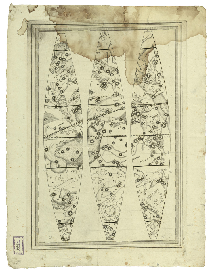 "...CALCOLATO PER IL CORRENTE ANNO SULLE OSSERVAZIONI DE' SIGG. FLAMSTEED, E DE LA CAILLE. ROMA PRESSO LA CALC.A CAM.LE 1792 INCISO DAL P. GIO M.A CASSINI C.R.S. "GLOBI DELINEATI DAL PADRE GIOVANNI MARIA CASSINI CHIERICO REGOLARE SOMASCO" costruiti per la Biblioteca dell' I.G.M. nell'anno 1928. Il materiale per formare i Globi è stato tracciato dal Cassini, che fu geografo, cartografo e intagliatore su rame. Al numero d'ordine 44 del catalogo è la descrizione del Testo: "INTRODUZIONE GENERALE ALLO STUDIO DELLA GEOGRAFIA" e del "NUOVO ATLANTE GEOGRAFICO UNIVERSALE IN TRE TOMI", editi fra gli anni 1792-1801, contenenti complessivamente 182 tavole artisticamente incise. Le tavole 7, 8, 9, 10, 15 e 17 del tomo I contengono i disegni per formare il GLOBO TERRESTRE. A costruire il GLOBO CELESTE sono servite le tavole 11, 12, 13, 14, 16 e 18 dello stesso tomo I. La periferia dei 12 spicchi è metri 1,06 in ambi i disegni altre caratteristiche comuni alle due sfere sono: linea equatoriale, tropici, eclittica, ampiezza degli spicchi all'equatore 30°. Il Globo terrestre è del 1843, ma prima di tale data esso subì delle varianti, concretate dopo accrescimenti per nuove scoperte geografiche e conseguenti rettifiche, nella attuale rappresentazione. I meridiani sono tracciati, come i paralleli, ogni 10°. Il meridiano iniziale, che passa per l'Isola del Ferro, l'equatore e l'eclittica, sono divisi in gradi. Il sostegno, o castello, è in legno tornito a quattro colonnine presenta sull'orizzonte incollata una carta colle indicazioni dei segni dello zodiaco, delle rose dei venti, e con la divisione di grado in grado. Una tabellina offre la lunghezza del grado del circolo massimo della Sfera terrestre in 14 diverse unità di misura. Il Globo celeste contiene le costellazioni, la via lattea, le stelle fino alla 6^ grandezza e le nebulose è calcolato per l'anno 1792 sui dati degli astronomi "Flamsteed e De la Caille". E' rivestito con spicchi come il Globo terrestre. Le due Sfere ruotano attorno un asse di acciaio che passa per i poli i sostegni sono eguali nei due Globi. "NUOVO ATLANTE GEOGRAFICO UNIVERSALE IN TRE TOMI", pubblicato in Roma presso la Calcografia Camerale, opera diretta per l'incisione da Padre G. M. Cassini. Il tomo I è dell'anno 1792, consta di carte 55 precedute da bella allegoria ideata da Tofanelli, incisa da Alessandro Mochetti. Il tomo II è dell'anno 1797, consta di carte 70, precedute da altra allegoria ideata e incisa da Demetrio Dragon. Il tomo III è dell'anno 1801, consta di 57 carte precedute da allegoria di Demetrio Dragon (come nel tomo II). L'opera grandiosa è stata favorita da Papa Pio VI. Redattore, specialmente del tomo I, è il Canonico D. Pietro Bonaccorsi. Del documento fanno parte un testo ed i globi. Testo: "INTRODUZIONE GENERALE ALLO STUDIO DELLA GEOGRAFIA" compendiosa notizia di pagine 34 stampata a Roma nella Calcografia Camerale, divisa in cinque parti: (1792-1801). Parte 1) della Sfera e de' due Globi celeste e terrestre. Parte 2) de' termini generali della Geografia. Parte 3) dell'origine, progressi e stato attuale della medesima. Parte 4) del metodo tenuto per il presente Atlante. Parte 5) delle navigazioni degli antichi fino a noi, e delle scoperte onde per loro mezzo si è arricchita la geografia. Di quest'opera si posseggono due copie, una è mancante del titolo."