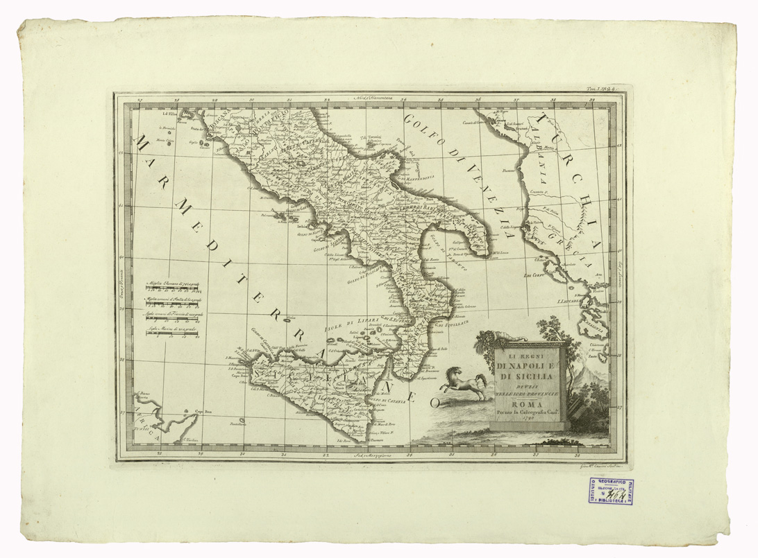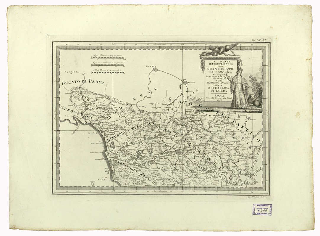 "...CHE COMPRENDE PORZIONI DELLO STATO FIORENTINO E DEL TERRITORIO PISANO CON LA REPUBBLICA DI LUCCA. ROMA PRESSO LA CALCOGRAFIA CAMERALE 1791. "NUOVO ATLANTE GEOGRAFICO UNIVERSALE IN TRE TOMI", pubblicato in Roma presso la Calcografia Camerale, opera diretta per l'incisione da Padre G. M. Cassini. Il tomo I è dell'anno 1792, consta di carte 55 precedute da bella allegoria ideata da Tofanelli, incisa da Alessandro Mochetti. Il tomo II è dell'anno 1797, consta di carte 70, precedute da altra allegoria ideata e incisa da Demetrio Dragon. Il tomo III è dell'anno 1801, consta di 57 carte precedute da allegoria di Demetrio Dragon (come nel tomo II). L'opera grandiosa è stata favorita da Papa Pio VI. Redattore, specialmente del tomo I, è il Canonico D. Pietro Bonaccorsi. Del documento fanno parte un testo ed i globi. Testo: "INTRODUZIONE GENERALE ALLO STUDIO DELLA GEOGRAFIA" compendiosa notizia di pagine 34 stampata a Roma nella Calcografia Camerale, divisa in cinque parti: (1792-1801). Parte 1) della Sfera e de' due Globi celeste e terrestre. Parte 2) de' termini generali della Geografia. Parte 3) dell'origine, progressi e stato attuale della medesima. Parte 4) del metodo tenuto per il presente Atlante. Parte 5) delle navigazioni degli antichi fino a noi, e delle scoperte onde per loro mezzo si è arricchita la geografia. Di quest'opera si posseggono due copie, una è mancante del titolo. "GLOBI DELINEATI DAL PADRE GIOVANNI MARIA CASSINI CHIERICO REGOLARE SOMASCO", costruiti per la Biblioteca dell' I.G.M. nell'anno 1928. Il materiale per formare i Globi è stato tracciato dal Cassini, che fu geografo, cartografo e intagliatore su rame. Al numero d'ordine 44 del catalogo è la descrizione del Testo: "INTRODUZIONE GENERALE ALLO STUDIO DELLA GEOGRAFIA" e del "NUOVO ATLANTE GEOGRAFICO UNIVERSALE IN TRE TOMI", editi fra gli anni 1792-1801, contenenti complessivamente 182 tavole artisticamente incise. Le tavole 7, 8, 9, 10, 15 e 17 del tomo I contengono i disegni per formare il GLOBO TERRESTRE. A costruire il GLOBO CELESTE sono servite le tavole 11, 12, 13, 14, 16 e 18 dello stesso tomo I. La periferia dei 12 spicchi è metri 1,06 in ambi i disegni altre caratteristiche comuni alle due sfere sono: linea equatoriale, tropici, eclittica, ampiezza degli spicchi all'equatore 30°. Il Globo terrestre è del 1843, ma prima di tale data esso subì delle varianti, concretate dopo accrescimenti per nuove scoperte geografiche e conseguenti rettifiche, nella attuale rappresentazione. I meridiani sono tracciati, come i paralleli, ogni 10°. Il meridiano iniziale, che passa per l'Isola del Ferro, l'equatore e l'eclittica, sono divisi in gradi. Il sostegno, o castello, è in legno tornito a quattro colonnine presenta sull'orizzonte incollata una carta colle indicazioni dei segni dello zodiaco, delle rose dei venti, e con la divisione di grado in grado. Una tabellina offre la lunghezza del grado del circolo massimo della Sfera terrestre in 14 diverse unità di misura. Il Globo celeste contiene le costellazioni, la via lattea, le stelle fino alla 6^ grandezza e le nebulose è calcolato per l'anno 1792 sui dati degli astronomi "Flamsteed e De la Caille". E' rivestito con spicchi come il Globo terrestre. Le due Sfere ruotano attorno un asse di acciaio che passa per i poli i sostegni sono eguali nei due Globi."