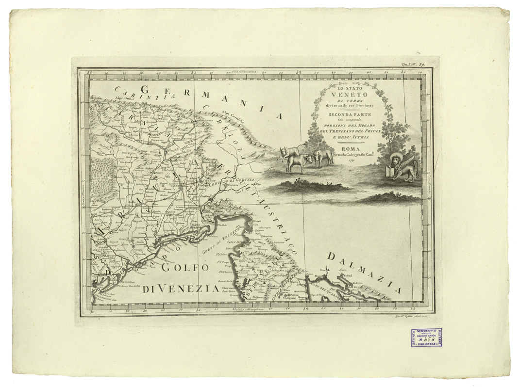 "...DA TERRA DIVISO NELLE SUE PROVINCIE SECONDA PARTE CHE COMPRENDE PORZIONI DEL DOGADO DEL TREVISANO DEL FRIULI E DELL'ISTRIA. ROMA PRESSO LA CALCOGRAFIA CAMERALE 1791. "NUOVO ATLANTE GEOGRAFICO UNIVERSALE IN TRE TOMI", pubblicato in Roma presso la Calcografia Camerale, opera diretta per l'incisione da Padre G. M. Cassini. Il tomo I è dell'anno 1792, consta di carte 55 precedute da bella allegoria ideata da Tofanelli, incisa da Alessandro Mochetti. Il tomo II è dell'anno 1797, consta di carte 70, precedute da altra allegoria ideata e incisa da Demetrio Dragon. Il tomo III è dell'anno 1801, consta di 57 carte precedute da allegoria di Demetrio Dragon (come nel tomo II). L'opera grandiosa è stata favorita da Papa Pio VI. Redattore, specialmente del tomo I, è il Canonico D. Pietro Bonaccorsi. Del documento fanno parte un testo ed i globi. Testo: "INTRODUZIONE GENERALE ALLO STUDIO DELLA GEOGRAFIA" compendiosa notizia di pagine 34 stampata a Roma nella Calcografia Camerale, divisa in cinque parti: (1792-1801). Parte 1) della Sfera e de' due Globi celeste e terrestre. Parte 2) de' termini generali della Geografia. Parte 3) dell'origine, progressi e stato attuale della medesima. Parte 4) del metodo tenuto per il presente Atlante. Parte 5) delle navigazioni degli antichi fino a noi, e delle scoperte onde per loro mezzo si è arricchita la geografia. Di quest'opera si posseggono due copie, una è mancante del titolo. "GLOBI DELINEATI DAL PADRE GIOVANNI MARIA CASSINI CHIERICO REGOLARE SOMASCO", costruiti per la Biblioteca dell' I.G.M. nell'anno 1928. Il materiale per formare i Globi è stato tracciato dal Cassini, che fu geografo, cartografo e intagliatore su rame. Al numero d'ordine 44 del catalogo è la descrizione del Testo: "INTRODUZIONE GENERALE ALLO STUDIO DELLA GEOGRAFIA" e del "NUOVO ATLANTE GEOGRAFICO UNIVERSALE IN TRE TOMI", editi fra gli anni 1792-1801, contenenti complessivamente 182 tavole artisticamente incise. Le tavole 7, 8, 9, 10, 15 e 17 del tomo I contengono i disegni per formare il GLOBO TERRESTRE. A costruire il GLOBO CELESTE sono servite le tavole 11, 12, 13, 14, 16 e 18 dello stesso tomo I. La periferia dei 12 spicchi è metri 1,06 in ambi i disegni altre caratteristiche comuni alle due sfere sono: linea equatoriale, tropici, eclittica, ampiezza degli spicchi all'equatore 30°. Il Globo terrestre è del 1843, ma prima di tale data esso subì delle varianti, concretate dopo accrescimenti per nuove scoperte geografiche e conseguenti rettifiche, nella attuale rappresentazione. I meridiani sono tracciati, come i paralleli, ogni 10°. Il meridiano iniziale, che passa per l'Isola del Ferro, l'equatore e l'eclittica, sono divisi in gradi. Il sostegno, o castello, è in legno tornito a quattro colonnine presenta sull'orizzonte incollata una carta colle indicazioni dei segni dello zodiaco, delle rose dei venti, e con la divisione di grado in grado. Una tabellina offre la lunghezza del grado del circolo massimo della Sfera terrestre in 14 diverse unità di misura. Il Globo celeste contiene le costellazioni, la via lattea, le stelle fino alla 6^ grandezza e le nebulose è calcolato per l'anno 1792 sui dati degli astronomi "Flamsteed e De la Caille". E' rivestito con spicchi come il Globo terrestre. Le due Sfere ruotano attorno un asse di acciaio che passa per i poli i sostegni sono eguali nei due Globi."