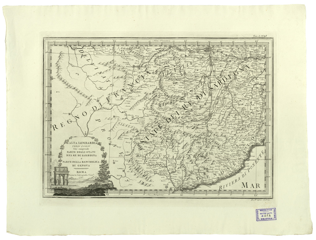"...TERZO FOGLIO CHE COMPRENDE PARTE DEGLI STATI DEL RE DI SARDEGNA E PARTE DELLA REPUBBLICA DI GENOVA. ROMA PRESSO LA CALCOGRAFIA CAMERALE 1791. "NUOVO ATLANTE GEOGRAFICO UNIVERSALE IN TRE TOMI", pubblicato in Roma presso la Calcografia Camerale, opera diretta per l'incisione da Padre G. M. Cassini. Il tomo I è dell'anno 1792, consta di carte 55 precedute da bella allegoria ideata da Tofanelli, incisa da Alessandro Mochetti. Il tomo II è dell'anno 1797, consta di carte 70, precedute da altra allegoria ideata e incisa da Demetrio Dragon. Il tomo III è dell'anno 1801, consta di 57 carte precedute da allegoria di Demetrio Dragon (come nel tomo II). L'opera grandiosa è stata favorita da Papa Pio VI. Redattore, specialmente del tomo I, è il Canonico D. Pietro Bonaccorsi. Del documento fanno parte un testo ed i globi. Testo: "INTRODUZIONE GENERALE ALLO STUDIO DELLA GEOGRAFIA" compendiosa notizia di pagine 34 stampata a Roma nella Calcografia Camerale, divisa in cinque parti: (1792-1801). Parte 1) della Sfera e de' due Globi celeste e terrestre. Parte 2) de' termini generali della Geografia. Parte 3) dell'origine, progressi e stato attuale della medesima. Parte 4) del metodo tenuto per il presente Atlante. Parte 5) delle navigazioni degli antichi fino a noi, e delle scoperte onde per loro mezzo si è arricchita la geografia. Di quest'opera si posseggono due copie, una è mancante del titolo. "GLOBI DELINEATI DAL PADRE GIOVANNI MARIA CASSINI CHIERICO REGOLARE SOMASCO", costruiti per la Biblioteca dell' I.G.M. nell'anno 1928. Il materiale per formare i Globi è stato tracciato dal Cassini, che fu geografo, cartografo e intagliatore su rame. Al numero d'ordine 44 del catalogo è la descrizione del Testo: "INTRODUZIONE GENERALE ALLO STUDIO DELLA GEOGRAFIA" e del "NUOVO ATLANTE GEOGRAFICO UNIVERSALE IN TRE TOMI", editi fra gli anni 1792-1801, contenenti complessivamente 182 tavole artisticamente incise. Le tavole 7, 8, 9, 10, 15 e 17 del tomo I contengono i disegni per formare il GLOBO TERRESTRE. A costruire il GLOBO CELESTE sono servite le tavole 11, 12, 13, 14, 16 e 18 dello stesso tomo I. La periferia dei 12 spicchi è metri 1,06 in ambi i disegni altre caratteristiche comuni alle due sfere sono: linea equatoriale, tropici, eclittica, ampiezza degli spicchi all'equatore 30°. Il Globo terrestre è del 1843, ma prima di tale data esso subì delle varianti, concretate dopo accrescimenti per nuove scoperte geografiche e conseguenti rettifiche, nella attuale rappresentazione. I meridiani sono tracciati, come i paralleli, ogni 10°. Il meridiano iniziale, che passa per l'Isola del Ferro, l'equatore e l'eclittica, sono divisi in gradi. Il sostegno, o castello, è in legno tornito a quattro colonnine presenta sull'orizzonte incollata una carta colle indicazioni dei segni dello zodiaco, delle rose dei venti, e con la divisione di grado in grado. Una tabellina offre la lunghezza del grado del circolo massimo della Sfera terrestre in 14 diverse unità di misura. Il Globo celeste contiene le costellazioni, la via lattea, le stelle fino alla 6^ grandezza e le nebulose è calcolato per l'anno 1792 sui dati degli astronomi "Flamsteed e De la Caille". E' rivestito con spicchi come il Globo terrestre. Le due Sfere ruotano attorno un asse di acciaio che passa per i poli i sostegni sono eguali nei due Globi."