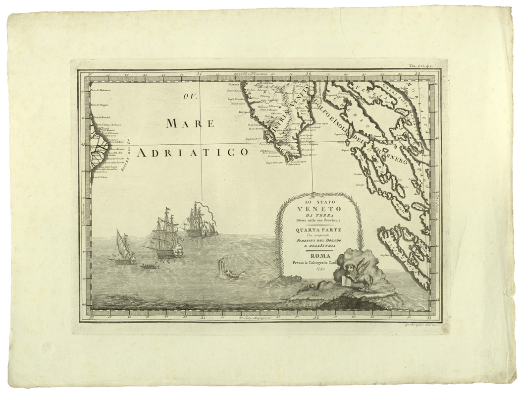 "...QUARTA PARTE CHE COMPRENDE PORZIONI DEL DOGADO E DELL'ISTRIA. ROMA PRESSO LA CALCOGRAFIA CAMERALE 1791. "NUOVO ATLANTE GEOGRAFICO UNIVERSALE IN TRE TOMI", pubblicato in Roma presso la Calcografia Camerale, opera diretta per l'incisione da Padre G. M. Cassini. Il tomo I è dell'anno 1792, consta di carte 55 precedute da bella allegoria ideata da Tofanelli, incisa da Alessandro Mochetti. Il tomo II è dell'anno 1797, consta di carte 70, precedute da altra allegoria ideata e incisa da Demetrio Dragon. Il tomo III è dell'anno 1801, consta di 57 carte precedute da allegoria di Demetrio Dragon (come nel tomo II). L'opera grandiosa è stata favorita da Papa Pio VI. Redattore, specialmente del tomo I, è il Canonico D. Pietro Bonaccorsi. Del documento fanno parte un testo ed i globi. Testo: "INTRODUZIONE GENERALE ALLO STUDIO DELLA GEOGRAFIA" compendiosa notizia di pagine 34 stampata a Roma nella Calcografia Camerale, divisa in cinque parti: (1792-1801). Parte 1) della Sfera e de' due Globi celeste e terrestre. Parte 2) de' termini generali della Geografia. Parte 3) dell'origine, progressi e stato attuale della medesima. Parte 4) del metodo tenuto per il presente Atlante. Parte 5) delle navigazioni degli antichi fino a noi, e delle scoperte onde per loro mezzo si è arricchita la geografia. Di quest'opera si posseggono due copie, una è mancante del titolo. "GLOBI DELINEATI DAL PADRE GIOVANNI MARIA CASSINI CHIERICO REGOLARE SOMASCO", costruiti per la Biblioteca dell' I.G.M. nell'anno 1928. Il materiale per formare i Globi è stato tracciato dal Cassini, che fu geografo, cartografo e intagliatore su rame. Al numero d'ordine 44 del catalogo è la descrizione del Testo: "INTRODUZIONE GENERALE ALLO STUDIO DELLA GEOGRAFIA" e del "NUOVO ATLANTE GEOGRAFICO UNIVERSALE IN TRE TOMI", editi fra gli anni 1792-1801, contenenti complessivamente 182 tavole artisticamente incise. Le tavole 7, 8, 9, 10, 15 e 17 del tomo I contengono i disegni per formare il GLOBO TERRESTRE. A costruire il GLOBO CELESTE sono servite le tavole 11, 12, 13, 14, 16 e 18 dello stesso tomo I. La periferia dei 12 spicchi è metri 1,06 in ambi i disegni altre caratteristiche comuni alle due sfere sono: linea equatoriale, tropici, eclittica, ampiezza degli spicchi all'equatore 30°. Il Globo terrestre è del 1843, ma prima di tale data esso subì delle varianti, concretate dopo accrescimenti per nuove scoperte geografiche e conseguenti rettifiche, nella attuale rappresentazione. I meridiani sono tracciati, come i paralleli, ogni 10°. Il meridiano iniziale, che passa per l'Isola del Ferro, l'equatore e l'eclittica, sono divisi in gradi. Il sostegno, o castello, è in legno tornito a quattro colonnine presenta sull'orizzonte incollata una carta colle indicazioni dei segni dello zodiaco, delle rose dei venti, e con la divisione di grado in grado. Una tabellina offre la lunghezza del grado del circolo massimo della Sfera terrestre in 14 diverse unità di misura. Il Globo celeste contiene le costellazioni, la via lattea, le stelle fino alla 6^ grandezza e le nebulose è calcolato per l'anno 1792 sui dati degli astronomi "Flamsteed e De la Caille". E' rivestito con spicchi come il Globo terrestre. Le due Sfere ruotano attorno un asse di acciaio che passa per i poli i sostegni sono eguali nei due Globi."