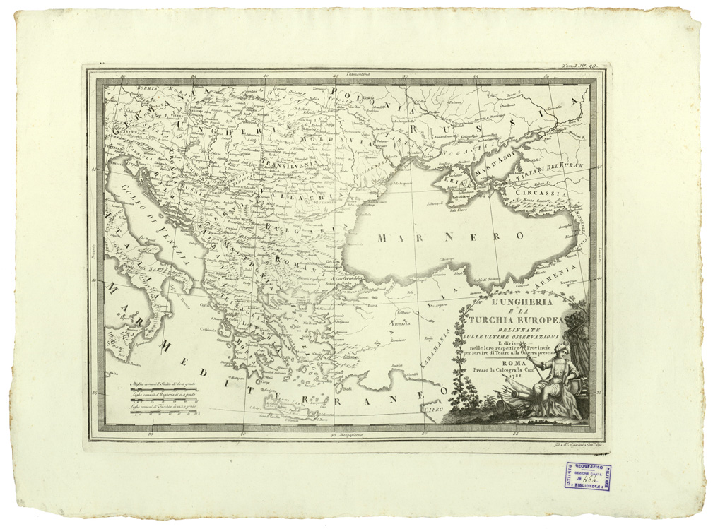 "...DELINEATE SULLE ULTIME OSSERVAZIONI E DIVISE NELLE LORO RESPETTIVE PROVINCIE PER SERVIRE DI TEATRO ALLA GUERRA PRESENTE. ROMA PRESSO LA CALCOGRAFIA CAM.LE 1788. "NUOVO ATLANTE GEOGRAFICO UNIVERSALE IN TRE TOMI", pubblicato in Roma presso la Calcografia Camerale, opera diretta per l'incisione da Padre G. M. Cassini. Il tomo I è dell'anno 1792, consta di carte 55 precedute da bella allegoria ideata da Tofanelli, incisa da Alessandro Mochetti. Il tomo II è dell'anno 1797, consta di carte 70, precedute da altra allegoria ideata e incisa da Demetrio Dragon. Il tomo III è dell'anno 1801, consta di 57 carte precedute da allegoria di Demetrio Dragon (come nel tomo II). L'opera grandiosa è stata favorita da Papa Pio VI. Redattore, specialmente del tomo I, è il Canonico D. Pietro Bonaccorsi. Del documento fanno parte un testo ed i globi. Testo: "INTRODUZIONE GENERALE ALLO STUDIO DELLA GEOGRAFIA" compendiosa notizia di pagine 34 stampata a Roma nella Calcografia Camerale, divisa in cinque parti: (1792-1801). Parte 1) della Sfera e de' due Globi celeste e terrestre. Parte 2) de' termini generali della Geografia. Parte 3) dell'origine, progressi e stato attuale della medesima. Parte 4) del metodo tenuto per il presente Atlante. Parte 5) delle navigazioni degli antichi fino a noi, e delle scoperte onde per loro mezzo si è arricchita la geografia. Di quest'opera si posseggono due copie, una è mancante del titolo. "GLOBI DELINEATI DAL PADRE GIOVANNI MARIA CASSINI CHIERICO REGOLARE SOMASCO", costruiti per la Biblioteca dell' I.G.M. nell'anno 1928. Il materiale per formare i Globi è stato tracciato dal Cassini, che fu geografo, cartografo e intagliatore su rame. Al numero d'ordine 44 del catalogo è la descrizione del Testo: "INTRODUZIONE GENERALE ALLO STUDIO DELLA GEOGRAFIA" e del "NUOVO ATLANTE GEOGRAFICO UNIVERSALE IN TRE TOMI", editi fra gli anni 1792-1801, contenenti complessivamente 182 tavole artisticamente incise. Le tavole 7, 8, 9, 10, 15 e 17 del tomo I contengono i disegni per formare il GLOBO TERRESTRE. A costruire il GLOBO CELESTE sono servite le tavole 11, 12, 13, 14, 16 e 18 dello stesso tomo I. La periferia dei 12 spicchi è metri 1,06 in ambi i disegni altre caratteristiche comuni alle due sfere sono: linea equatoriale, tropici, eclittica, ampiezza degli spicchi all'equatore 30°. Il Globo terrestre è del 1843, ma prima di tale data esso subì delle varianti, concretate dopo accrescimenti per nuove scoperte geografiche e conseguenti rettifiche, nella attuale rappresentazione. I meridiani sono tracciati, come i paralleli, ogni 10°. Il meridiano iniziale, che passa per l'Isola del Ferro, l'equatore e l'eclittica, sono divisi in gradi. Il sostegno, o castello, è in legno tornito a quattro colonnine presenta sull'orizzonte incollata una carta colle indicazioni dei segni dello zodiaco, delle rose dei venti, e con la divisione di grado in grado. Una tabellina offre la lunghezza del grado del circolo massimo della Sfera terrestre in 14 diverse unità di misura. Il Globo celeste contiene le costellazioni, la via lattea, le stelle fino alla 6^ grandezza e le nebulose è calcolato per l'anno 1792 sui dati degli astronomi "Flamsteed e De la Caille". E' rivestito con spicchi come il Globo terrestre. Le due Sfere ruotano attorno un asse di acciaio che passa per i poli i sostegni sono eguali nei due Globi."