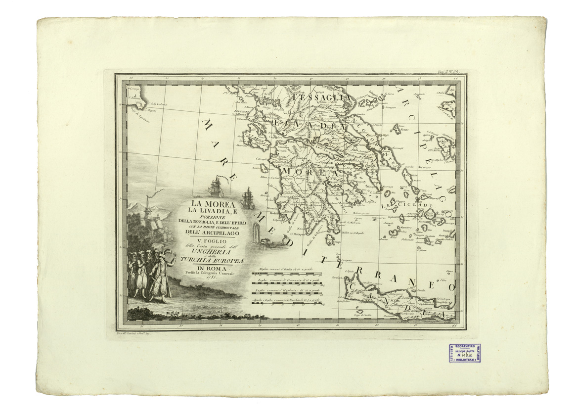 "...CON LA PARTE OCCIDENTALE DELL'ARCIPELAGO. V. FOGLIO DELLA CARTA GENERALE DELL'UNGHERIA E DELLA TURCHIA EUROPEA. IN ROMA PRESSO LA CALCOGRAFIA CAMERALE 1788. "NUOVO ATLANTE GEOGRAFICO UNIVERSALE IN TRE TOMI", pubblicato in Roma presso la Calcografia Camerale, opera diretta per l'incisione da Padre G. M. Cassini. Il tomo I è dell'anno 1792, consta di carte 55 precedute da bella allegoria ideata da Tofanelli, incisa da Alessandro Mochetti. Il tomo II è dell'anno 1797, consta di carte 70, precedute da altra allegoria ideata e incisa da Demetrio Dragon. Il tomo III è dell'anno 1801, consta di 57 carte precedute da allegoria di Demetrio Dragon (come nel tomo II). L'opera grandiosa è stata favorita da Papa Pio VI. Redattore, specialmente del tomo I, è il Canonico D. Pietro Bonaccorsi. Del documento fanno parte un testo ed i globi. Testo: "INTRODUZIONE GENERALE ALLO STUDIO DELLA GEOGRAFIA" compendiosa notizia di pagine 34 stampata a Roma nella Calcografia Camerale, divisa in cinque parti: (1792-1801). Parte 1) della Sfera e de' due Globi celeste e terrestre. Parte 2) de' termini generali della Geografia. Parte 3) dell'origine, progressi e stato attuale della medesima. Parte 4) del metodo tenuto per il presente Atlante. Parte 5) delle navigazioni degli antichi fino a noi, e delle scoperte onde per loro mezzo si è arricchita la geografia. Di quest'opera si posseggono due copie, una è mancante del titolo. "GLOBI DELINEATI DAL PADRE GIOVANNI MARIA CASSINI CHIERICO REGOLARE SOMASCO", costruiti per la Biblioteca dell' I.G.M. nell'anno 1928. Il materiale per formare i Globi è stato tracciato dal Cassini, che fu geografo, cartografo e intagliatore su rame. Al numero d'ordine 44 del catalogo è la descrizione del Testo: "INTRODUZIONE GENERALE ALLO STUDIO DELLA GEOGRAFIA" e del "NUOVO ATLANTE GEOGRAFICO UNIVERSALE IN TRE TOMI", editi fra gli anni 1792-1801, contenenti complessivamente 182 tavole artisticamente incise. Le tavole 7, 8, 9, 10, 15 e 17 del tomo I contengono i disegni per formare il GLOBO TERRESTRE. A costruire il GLOBO CELESTE sono servite le tavole 11, 12, 13, 14, 16 e 18 dello stesso tomo I. La periferia dei 12 spicchi è metri 1,06 in ambi i disegni altre caratteristiche comuni alle due sfere sono: linea equatoriale, tropici, eclittica, ampiezza degli spicchi all'equatore 30°. Il Globo terrestre è del 1843, ma prima di tale data esso subì delle varianti, concretate dopo accrescimenti per nuove scoperte geografiche e conseguenti rettifiche, nella attuale rappresentazione. I meridiani sono tracciati, come i paralleli, ogni 10°. Il meridiano iniziale, che passa per l'Isola del Ferro, l'equatore e l'eclittica, sono divisi in gradi. Il sostegno, o castello, è in legno tornito a quattro colonnine presenta sull'orizzonte incollata una carta colle indicazioni dei segni dello zodiaco, delle rose dei venti, e con la divisione di grado in grado. Una tabellina offre la lunghezza del grado del circolo massimo della Sfera terrestre in 14 diverse unità di misura. Il Globo celeste contiene le costellazioni, la via lattea, le stelle fino alla 6^ grandezza e le nebulose è calcolato per l'anno 1792 sui dati degli astronomi "Flamsteed e De la Caille". E' rivestito con spicchi come il Globo terrestre. Le due Sfere ruotano attorno un asse di acciaio che passa per i poli i sostegni sono eguali nei due Globi."