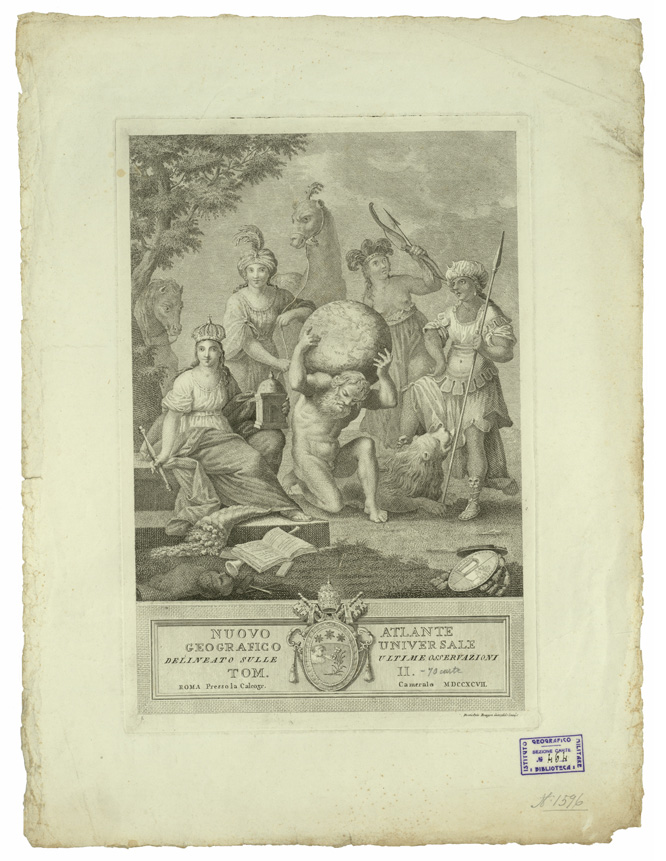 "...DELINEATO SULLE ULTIME OSSERVAZIONI. ROMA PRESSO LA CALCOGRAFIA CAMERALE MDCCXCII. "NUOVO ATLANTE GEOGRAFICO UNIVERSALE IN TRE TOMI", pubblicato in Roma presso la Calcografia Camerale, opera diretta per l'incisione da Padre G. M. Cassini. Il tomo I è dell'anno 1792, consta di carte 55 precedute da bella allegoria ideata da Tofanelli, incisa da Alessandro Mochetti. Il tomo II è dell'anno 1797, consta di carte 70, precedute da altra allegoria ideata e incisa da Demetrio Dragon. Il tomo III è dell'anno 1801, consta di 57 carte precedute da allegoria di Demetrio Dragon (come nel tomo II). L'opera grandiosa è stata favorita da Papa Pio VI. Redattore, specialmente del tomo I, è il Canonico D. Pietro Bonaccorsi. Del documento fanno parte un testo ed i globi. Testo: "INTRODUZIONE GENERALE ALLO STUDIO DELLA GEOGRAFIA" compendiosa notizia di pagine 34 stampata a Roma nella Calcografia Camerale, divisa in cinque parti: (1792-1801). Parte 1) della Sfera e de' due Globi celeste e terrestre. Parte 2) de' termini generali della Geografia. Parte 3) dell'origine, progressi e stato attuale della medesima. Parte 4) del metodo tenuto per il presente Atlante. Parte 5) delle navigazioni degli antichi fino a noi, e delle scoperte onde per loro mezzo si è arricchita la geografia. Di quest'opera si posseggono due copie, una è mancante del titolo. "GLOBI DELINEATI DAL PADRE GIOVANNI MARIA CASSINI CHIERICO REGOLARE SOMASCO", costruiti per la Biblioteca dell' I.G.M. nell'anno 1928. Il materiale per formare i Globi è stato tracciato dal Cassini, che fu geografo, cartografo e intagliatore su rame. Al numero d'ordine 44 del catalogo è la descrizione del Testo: "INTRODUZIONE GENERALE ALLO STUDIO DELLA GEOGRAFIA" e del "NUOVO ATLANTE GEOGRAFICO UNIVERSALE IN TRE TOMI", editi fra gli anni 1792-1801, contenenti complessivamente 182 tavole artisticamente incise. Le tavole 7, 8, 9, 10, 15 e 17 del tomo I contengono i disegni per formare il GLOBO TERRESTRE. A costruire il GLOBO CELESTE sono servite le tavole 11, 12, 13, 14, 16 e 18 dello stesso tomo I. La periferia dei 12 spicchi è metri 1,06 in ambi i disegni altre caratteristiche comuni alle due sfere sono: linea equatoriale, tropici, eclittica, ampiezza degli spicchi all'equatore 30°. Il Globo terrestre è del 1843, ma prima di tale data esso subì delle varianti, concretate dopo accrescimenti per nuove scoperte geografiche e conseguenti rettifiche, nella attuale rappresentazione. I meridiani sono tracciati, come i paralleli, ogni 10°. Il meridiano iniziale, che passa per l'Isola del Ferro, l'equatore e l'eclittica, sono divisi in gradi. Il sostegno, o castello, è in legno tornito a quattro colonnine presenta sull'orizzonte incollata una carta colle indicazioni dei segni dello zodiaco, delle rose dei venti, e con la divisione di grado in grado. Una tabellina offre la lunghezza del grado del circolo massimo della Sfera terrestre in 14 diverse unità di misura. Il Globo celeste contiene le costellazioni, la via lattea, le stelle fino alla 6^ grandezza e le nebulose è calcolato per l'anno 1792 sui dati degli astronomi "Flamsteed e De la Caille". E' rivestito con spicchi come il Globo terrestre. Le due Sfere ruotano attorno un asse di acciaio che passa per i poli i sostegni sono eguali nei due Globi."