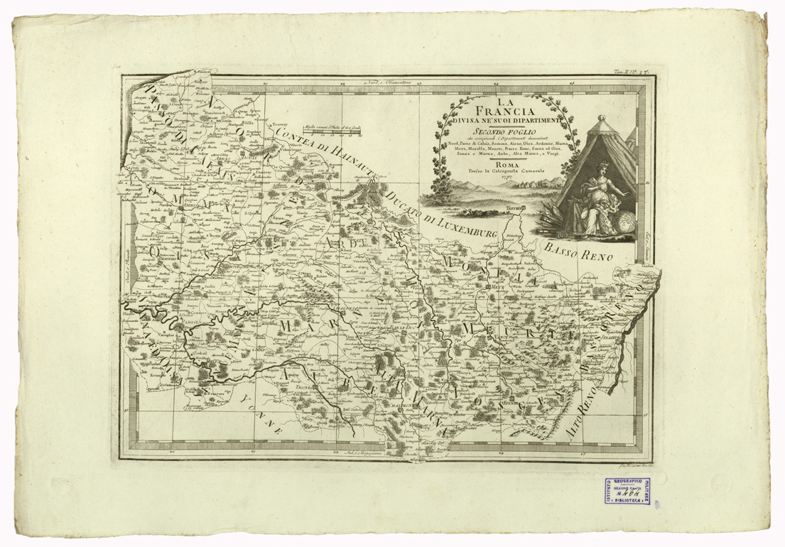 "...CHE COMPRENDE I DIPARTIMENTI DENOMINATI NORD, PASSO DI CALAIS, SOMMA, AISNE, OISA, ARDENNE, MARNA, MOSA, MOSELLA, MEURTE, BASSO RENO, SENNA ED OISA, SENNA E MARNA, AUBE, ALTA MARNA, E VOSGI. ROMA PRESSO LA CALCOGRAFIA CAMERALE 1797. "NUOVO ATLANTE GEOGRAFICO UNIVERSALE IN TRE TOMI", pubblicato in Roma presso la Calcografia Camerale, opera diretta per l'incisione da Padre G. M. Cassini. Il tomo I è dell'anno 1792, consta di carte 55 precedute da bella allegoria ideata da Tofanelli, incisa da Alessandro Mochetti. Il tomo II è dell'anno 1797, consta di carte 70, precedute da altra allegoria ideata e incisa da Demetrio Dragon. Il tomo III è dell'anno 1801, consta di 57 carte precedute da allegoria di Demetrio Dragon (come nel tomo II). L'opera grandiosa è stata favorita da Papa Pio VI. Redattore, specialmente del tomo I, è il Canonico D. Pietro Bonaccorsi. Del documento fanno parte un testo ed i globi. Testo: "INTRODUZIONE GENERALE ALLO STUDIO DELLA GEOGRAFIA" compendiosa notizia di pagine 34 stampata a Roma nella Calcografia Camerale, divisa in cinque parti: (1792-1801). Parte 1) della Sfera e de' due Globi celeste e terrestre. Parte 2) de' termini generali della Geografia. Parte 3) dell'origine, progressi e stato attuale della medesima. Parte 4) del metodo tenuto per il presente Atlante. Parte 5) delle navigazioni degli antichi fino a noi, e delle scoperte onde per loro mezzo si è arricchita la geografia. Di quest'opera si posseggono due copie, una è mancante del titolo. "GLOBI DELINEATI DAL PADRE GIOVANNI MARIA CASSINI CHIERICO REGOLARE SOMASCO", costruiti per la Biblioteca dell' I.G.M. nell'anno 1928. Il materiale per formare i Globi è stato tracciato dal Cassini, che fu geografo, cartografo e intagliatore su rame. Al numero d'ordine 44 del catalogo è la descrizione del Testo: "INTRODUZIONE GENERALE ALLO STUDIO DELLA GEOGRAFIA" e del "NUOVO ATLANTE GEOGRAFICO UNIVERSALE IN TRE TOMI", editi fra gli anni 1792-1801, contenenti complessivamente 182 tavole artisticamente incise. Le tavole 7, 8, 9, 10, 15 e 17 del tomo I contengono i disegni per formare il GLOBO TERRESTRE. A costruire il GLOBO CELESTE sono servite le tavole 11, 12, 13, 14, 16 e 18 dello stesso tomo I. La periferia dei 12 spicchi è metri 1,06 in ambi i disegni altre caratteristiche comuni alle due sfere sono: linea equatoriale, tropici, eclittica, ampiezza degli spicchi all'equatore 30°. Il Globo terrestre è del 1843, ma prima di tale data esso subì delle varianti, concretate dopo accrescimenti per nuove scoperte geografiche e conseguenti rettifiche, nella attuale rappresentazione. I meridiani sono tracciati, come i paralleli, ogni 10°. Il meridiano iniziale, che passa per l'Isola del Ferro, l'equatore e l'eclittica, sono divisi in gradi. Il sostegno, o castello, è in legno tornito a quattro colonnine presenta sull'orizzonte incollata una carta colle indicazioni dei segni dello zodiaco, delle rose dei venti, e con la divisione di grado in grado. Una tabellina offre la lunghezza del grado del circolo massimo della Sfera terrestre in 14 diverse unità di misura. Il Globo celeste contiene le costellazioni, la via lattea, le stelle fino alla 6^ grandezza e le nebulose è calcolato per l'anno 1792 sui dati degli astronomi "Flamsteed e De la Caille". E' rivestito con spicchi come il Globo terrestre. Le due Sfere ruotano attorno un asse di acciaio che passa per i poli i sostegni sono eguali nei due Globi."