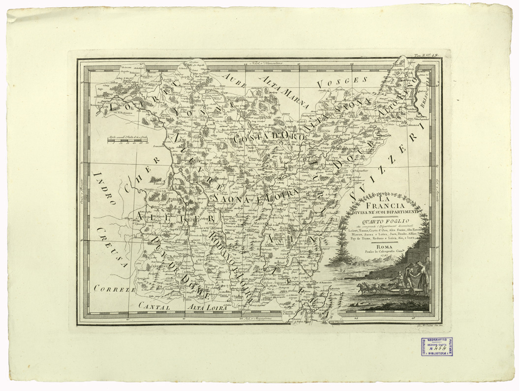 "...CHE COMPRENDE I DIPARTIMENTI DENOMINATI LOIRET, YONNE, COSTA D'ORO, ALTA SAONA, ALTO RENO, NIEVRE, SAONA E LOIRA, JURA, DOUBS, ALLIER, PUY DE DOME, RODANO E LOIRA, AIN, E ISERA. ROMA PRESSO LA CALCOGRAFIA CAMERALE 1797. "NUOVO ATLANTE GEOGRAFICO UNIVERSALE IN TRE TOMI", pubblicato in Roma presso la Calcografia Camerale, opera diretta per l'incisione da Padre G. M. Cassini. Il tomo I è dell'anno 1792, consta di carte 55 precedute da bella allegoria ideata da Tofanelli, incisa da Alessandro Mochetti. Il tomo II è dell'anno 1797, consta di carte 70, precedute da altra allegoria ideata e incisa da Demetrio Dragon. Il tomo III è dell'anno 1801, consta di 57 carte precedute da allegoria di Demetrio Dragon (come nel tomo II). L'opera grandiosa è stata favorita da Papa Pio VI. Redattore, specialmente del tomo I, è il Canonico D. Pietro Bonaccorsi. Del documento fanno parte un testo ed i globi. Testo: "INTRODUZIONE GENERALE ALLO STUDIO DELLA GEOGRAFIA" compendiosa notizia di pagine 34 stampata a Roma nella Calcografia Camerale, divisa in cinque parti: (1792-1801). Parte 1) della Sfera e de' due Globi celeste e terrestre. Parte 2) de' termini generali della Geografia. Parte 3) dell'origine, progressi e stato attuale della medesima. Parte 4) del metodo tenuto per il presente Atlante. Parte 5) delle navigazioni degli antichi fino a noi, e delle scoperte onde per loro mezzo si è arricchita la geografia. Di quest'opera si posseggono due copie, una è mancante del titolo. "GLOBI DELINEATI DAL PADRE GIOVANNI MARIA CASSINI CHIERICO REGOLARE SOMASCO", costruiti per la Biblioteca dell' I.G.M. nell'anno 1928. Il materiale per formare i Globi è stato tracciato dal Cassini, che fu geografo, cartografo e intagliatore su rame. Al numero d'ordine 44 del catalogo è la descrizione del Testo: "INTRODUZIONE GENERALE ALLO STUDIO DELLA GEOGRAFIA" e del "NUOVO ATLANTE GEOGRAFICO UNIVERSALE IN TRE TOMI", editi fra gli anni 1792-1801, contenenti complessivamente 182 tavole artisticamente incise. Le tavole 7, 8, 9, 10, 15 e 17 del tomo I contengono i disegni per formare il GLOBO TERRESTRE. A costruire il GLOBO CELESTE sono servite le tavole 11, 12, 13, 14, 16 e 18 dello stesso tomo I. La periferia dei 12 spicchi è metri 1,06 in ambi i disegni altre caratteristiche comuni alle due sfere sono: linea equatoriale, tropici, eclittica, ampiezza degli spicchi all'equatore 30°. Il Globo terrestre è del 1843, ma prima di tale data esso subì delle varianti, concretate dopo accrescimenti per nuove scoperte geografiche e conseguenti rettifiche, nella attuale rappresentazione. I meridiani sono tracciati, come i paralleli, ogni 10°. Il meridiano iniziale, che passa per l'Isola del Ferro, l'equatore e l'eclittica, sono divisi in gradi. Il sostegno, o castello, è in legno tornito a quattro colonnine presenta sull'orizzonte incollata una carta colle indicazioni dei segni dello zodiaco, delle rose dei venti, e con la divisione di grado in grado. Una tabellina offre la lunghezza del grado del circolo massimo della Sfera terrestre in 14 diverse unità di misura. Il Globo celeste contiene le costellazioni, la via lattea, le stelle fino alla 6^ grandezza e le nebulose è calcolato per l'anno 1792 sui dati degli astronomi "Flamsteed e De la Caille". E' rivestito con spicchi come il Globo terrestre. Le due Sfere ruotano attorno un asse di acciaio che passa per i poli i sostegni sono eguali nei due Globi."