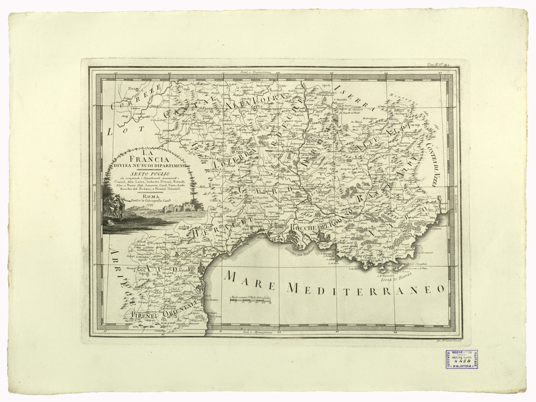 "...CHE COMPRENDE I DIPARTIMENTI DENOMINATI CANTAL, ALTA LOIRA, ARDECHE, DROMA, HERAULT, ALTE, E BASSE ALPI, LOZERRA, GARD, VARO, AUDE, BOCCHE DEL RODANO, E PIRENEI ORIENTALI. ROMA PRESSO LA CALCOGRAFIA CAMERALE 1797. "NUOVO ATLANTE GEOGRAFICO UNIVERSALE IN TRE TOMI", pubblicato in Roma presso la Calcografia Camerale, opera diretta per l'incisione da Padre G. M. Cassini. Il tomo I è dell'anno 1792, consta di carte 55 precedute da bella allegoria ideata da Tofanelli, incisa da Alessandro Mochetti. Il tomo II è dell'anno 1797, consta di carte 70, precedute da altra allegoria ideata e incisa da Demetrio Dragon. Il tomo III è dell'anno 1801, consta di 57 carte precedute da allegoria di Demetrio Dragon (come nel tomo II). L'opera grandiosa è stata favorita da Papa Pio VI. Redattore, specialmente del tomo I, è il Canonico D. Pietro Bonaccorsi. Del documento fanno parte un testo ed i globi. Testo: "INTRODUZIONE GENERALE ALLO STUDIO DELLA GEOGRAFIA" compendiosa notizia di pagine 34 stampata a Roma nella Calcografia Camerale, divisa in cinque parti: (1792-1801). Parte 1) della Sfera e de' due Globi celeste e terrestre. Parte 2) de' termini generali della Geografia. Parte 3) dell'origine, progressi e stato attuale della medesima. Parte 4) del metodo tenuto per il presente Atlante. Parte 5) delle navigazioni degli antichi fino a noi, e delle scoperte onde per loro mezzo si è arricchita la geografia. Di quest'opera si posseggono due copie, una è mancante del titolo. "GLOBI DELINEATI DAL PADRE GIOVANNI MARIA CASSINI CHIERICO REGOLARE SOMASCO", costruiti per la Biblioteca dell' I.G.M. nell'anno 1928. Il materiale per formare i Globi è stato tracciato dal Cassini, che fu geografo, cartografo e intagliatore su rame. Al numero d'ordine 44 del catalogo è la descrizione del Testo: "INTRODUZIONE GENERALE ALLO STUDIO DELLA GEOGRAFIA" e del "NUOVO ATLANTE GEOGRAFICO UNIVERSALE IN TRE TOMI", editi fra gli anni 1792-1801, contenenti complessivamente 182 tavole artisticamente incise. Le tavole 7, 8, 9, 10, 15 e 17 del tomo I contengono i disegni per formare il GLOBO TERRESTRE. A costruire il GLOBO CELESTE sono servite le tavole 11, 12, 13, 14, 16 e 18 dello stesso tomo I. La periferia dei 12 spicchi è metri 1,06 in ambi i disegni altre caratteristiche comuni alle due sfere sono: linea equatoriale, tropici, eclittica, ampiezza degli spicchi all'equatore 30°. Il Globo terrestre è del 1843, ma prima di tale data esso subì delle varianti, concretate dopo accrescimenti per nuove scoperte geografiche e conseguenti rettifiche, nella attuale rappresentazione. I meridiani sono tracciati, come i paralleli, ogni 10°. Il meridiano iniziale, che passa per l'Isola del Ferro, l'equatore e l'eclittica, sono divisi in gradi. Il sostegno, o castello, è in legno tornito a quattro colonnine presenta sull'orizzonte incollata una carta colle indicazioni dei segni dello zodiaco, delle rose dei venti, e con la divisione di grado in grado. Una tabellina offre la lunghezza del grado del circolo massimo della Sfera terrestre in 14 diverse unità di misura. Il Globo celeste contiene le costellazioni, la via lattea, le stelle fino alla 6^ grandezza e le nebulose è calcolato per l'anno 1792 sui dati degli astronomi "Flamsteed e De la Caille". E' rivestito con spicchi come il Globo terrestre. Le due Sfere ruotano attorno un asse di acciaio che passa per i poli i sostegni sono eguali nei due Globi."