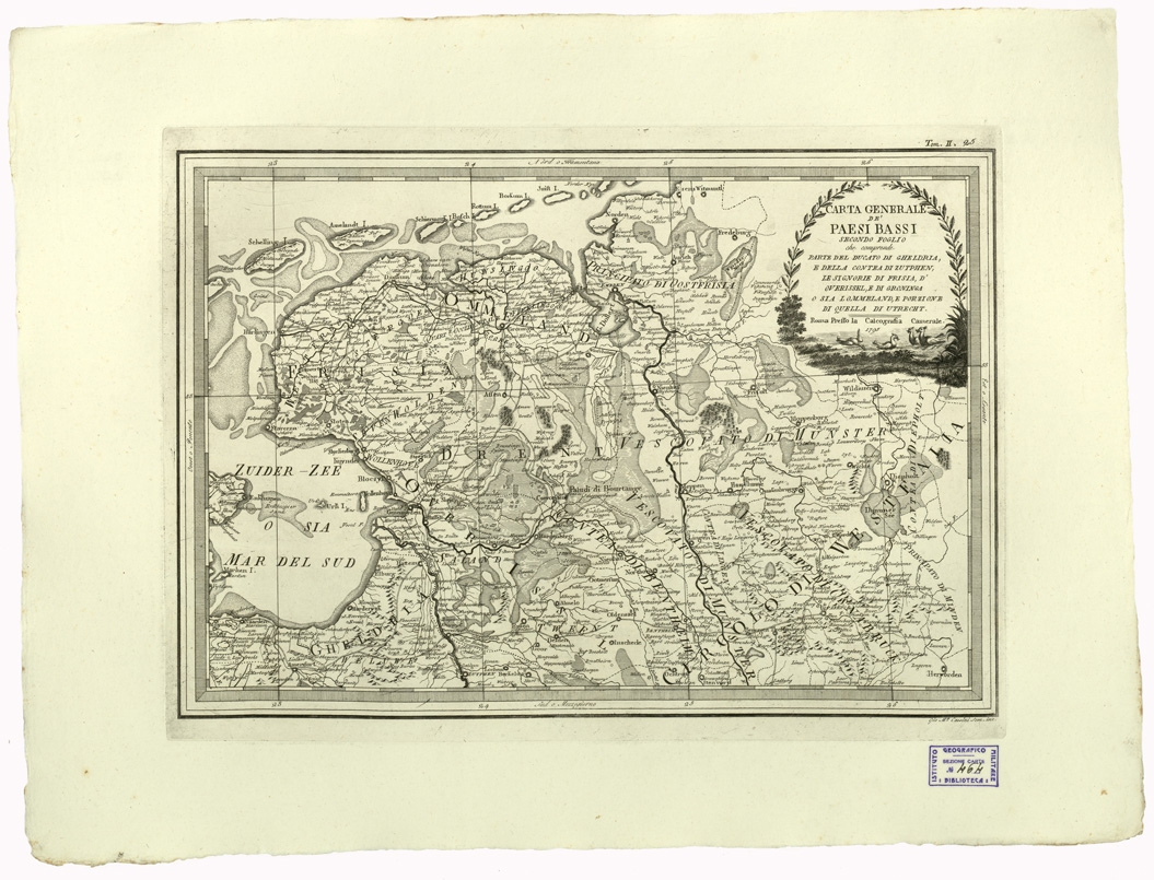 "...CHE COMPRENDE PARTE DEL DUCATO DI GHELDRIA, E DELLA CONTEA DI ZUTPHEN, LE SIGNORIE DI FRISIA, D'OVERISSEL, E DI GRONINGA O SIA LOMMELAND, E PORZIONE DI QUELLA DI UTRECHT. ROMA PRESSO LA CALCOGRAFIA CAM.LE 1795. "NUOVO ATLANTE GEOGRAFICO UNIVERSALE IN TRE TOMI", pubblicato in Roma presso la Calcografia Camerale, opera diretta per l'incisione da Padre G. M. Cassini. Il tomo I è dell'anno 1792, consta di carte 55 precedute da bella allegoria ideata da Tofanelli, incisa da Alessandro Mochetti. Il tomo II è dell'anno 1797, consta di carte 70, precedute da altra allegoria ideata e incisa da Demetrio Dragon. Il tomo III è dell'anno 1801, consta di 57 carte precedute da allegoria di Demetrio Dragon (come nel tomo II). L'opera grandiosa è stata favorita da Papa Pio VI. Redattore, specialmente del tomo I, è il Canonico D. Pietro Bonaccorsi. Del documento fanno parte un testo ed i globi. Testo: "INTRODUZIONE GENERALE ALLO STUDIO DELLA GEOGRAFIA" compendiosa notizia di pagine 34 stampata a Roma nella Calcografia Camerale, divisa in cinque parti: (1792-1801). Parte 1) della Sfera e de' due Globi celeste e terrestre. Parte 2) de' termini generali della Geografia. Parte 3) dell'origine, progressi e stato attuale della medesima. Parte 4) del metodo tenuto per il presente Atlante. Parte 5) delle navigazioni degli antichi fino a noi, e delle scoperte onde per loro mezzo si è arricchita la geografia. Di quest'opera si posseggono due copie, una è mancante del titolo. "GLOBI DELINEATI DAL PADRE GIOVANNI MARIA CASSINI CHIERICO REGOLARE SOMASCO", costruiti per la Biblioteca dell' I.G.M. nell'anno 1928. Il materiale per formare i Globi è stato tracciato dal Cassini, che fu geografo, cartografo e intagliatore su rame. Al numero d'ordine 44 del catalogo è la descrizione del Testo: "INTRODUZIONE GENERALE ALLO STUDIO DELLA GEOGRAFIA" e del "NUOVO ATLANTE GEOGRAFICO UNIVERSALE IN TRE TOMI", editi fra gli anni 1792-1801, contenenti complessivamente 182 tavole artisticamente incise. Le tavole 7, 8, 9, 10, 15 e 17 del tomo I contengono i disegni per formare il GLOBO TERRESTRE. A costruire il GLOBO CELESTE sono servite le tavole 11, 12, 13, 14, 16 e 18 dello stesso tomo I. La periferia dei 12 spicchi è metri 1,06 in ambi i disegni altre caratteristiche comuni alle due sfere sono: linea equatoriale, tropici, eclittica, ampiezza degli spicchi all'equatore 30°. Il Globo terrestre è del 1843, ma prima di tale data esso subì delle varianti, concretate dopo accrescimenti per nuove scoperte geografiche e conseguenti rettifiche, nella attuale rappresentazione. I meridiani sono tracciati, come i paralleli, ogni 10°. Il meridiano iniziale, che passa per l'Isola del Ferro, l'equatore e l'eclittica, sono divisi in gradi. Il sostegno, o castello, è in legno tornito a quattro colonnine presenta sull'orizzonte incollata una carta colle indicazioni dei segni dello zodiaco, delle rose dei venti, e con la divisione di grado in grado. Una tabellina offre la lunghezza del grado del circolo massimo della Sfera terrestre in 14 diverse unità di misura. Il Globo celeste contiene le costellazioni, la via lattea, le stelle fino alla 6^ grandezza e le nebulose è calcolato per l'anno 1792 sui dati degli astronomi "Flamsteed e De la Caille". E' rivestito con spicchi come il Globo terrestre. Le due Sfere ruotano attorno un asse di acciaio che passa per i poli i sostegni sono eguali nei due Globi."