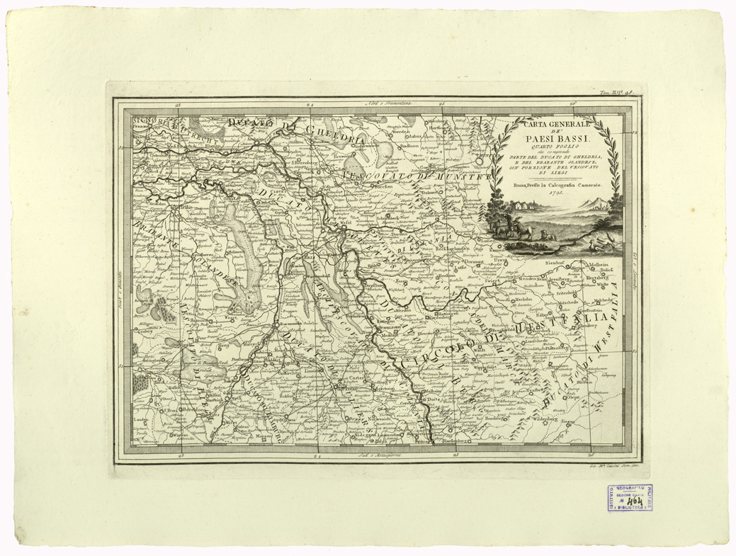 "...CHE COMPRENDE PARTE DEL DUCATO DI GHELDRIA, E DEL BRABANTE OLANDESE, CON PORZIONE DEL VESCOVATO DI LIEGI. ROMA, PRESSO LA CALCOGRAFIA CAMERALE. 1795. "NUOVO ATLANTE GEOGRAFICO UNIVERSALE IN TRE TOMI", pubblicato in Roma presso la Calcografia Camerale, opera diretta per l'incisione da Padre G. M. Cassini. Il tomo I è dell'anno 1792, consta di carte 55 precedute da bella allegoria ideata da Tofanelli, incisa da Alessandro Mochetti. Il tomo II è dell'anno 1797, consta di carte 70, precedute da altra allegoria ideata e incisa da Demetrio Dragon. Il tomo III è dell'anno 1801, consta di 57 carte precedute da allegoria di Demetrio Dragon (come nel tomo II). L'opera grandiosa è stata favorita da Papa Pio VI. Redattore, specialmente del tomo I, è il Canonico D. Pietro Bonaccorsi. Del documento fanno parte un testo ed i globi. Testo: "INTRODUZIONE GENERALE ALLO STUDIO DELLA GEOGRAFIA" compendiosa notizia di pagine 34 stampata a Roma nella Calcografia Camerale, divisa in cinque parti: (1792-1801). Parte 1) della Sfera e de' due Globi celeste e terrestre. Parte 2) de' termini generali della Geografia. Parte 3) dell'origine, progressi e stato attuale della medesima. Parte 4) del metodo tenuto per il presente Atlante. Parte 5) delle navigazioni degli antichi fino a noi, e delle scoperte onde per loro mezzo si è arricchita la geografia. Di quest'opera si posseggono due copie, una è mancante del titolo. "GLOBI DELINEATI DAL PADRE GIOVANNI MARIA CASSINI CHIERICO REGOLARE SOMASCO", costruiti per la Biblioteca dell' I.G.M. nell'anno 1928. Il materiale per formare i Globi è stato tracciato dal Cassini, che fu geografo, cartografo e intagliatore su rame. Al numero d'ordine 44 del catalogo è la descrizione del Testo: "INTRODUZIONE GENERALE ALLO STUDIO DELLA GEOGRAFIA" e del "NUOVO ATLANTE GEOGRAFICO UNIVERSALE IN TRE TOMI", editi fra gli anni 1792-1801, contenenti complessivamente 182 tavole artisticamente incise. Le tavole 7, 8, 9, 10, 15 e 17 del tomo I contengono i disegni per formare il GLOBO TERRESTRE. A costruire il GLOBO CELESTE sono servite le tavole 11, 12, 13, 14, 16 e 18 dello stesso tomo I. La periferia dei 12 spicchi è metri 1,06 in ambi i disegni altre caratteristiche comuni alle due sfere sono: linea equatoriale, tropici, eclittica, ampiezza degli spicchi all'equatore 30°. Il Globo terrestre è del 1843, ma prima di tale data esso subì delle varianti, concretate dopo accrescimenti per nuove scoperte geografiche e conseguenti rettifiche, nella attuale rappresentazione. I meridiani sono tracciati, come i paralleli, ogni 10°. Il meridiano iniziale, che passa per l'Isola del Ferro, l'equatore e l'eclittica, sono divisi in gradi. Il sostegno, o castello, è in legno tornito a quattro colonnine presenta sull'orizzonte incollata una carta colle indicazioni dei segni dello zodiaco, delle rose dei venti, e con la divisione di grado in grado. Una tabellina offre la lunghezza del grado del circolo massimo della Sfera terrestre in 14 diverse unità di misura. Il Globo celeste contiene le costellazioni, la via lattea, le stelle fino alla 6^ grandezza e le nebulose è calcolato per l'anno 1792 sui dati degli astronomi "Flamsteed e De la Caille". E' rivestito con spicchi come il Globo terrestre. Le due Sfere ruotano attorno un asse di acciaio che passa per i poli i sostegni sono eguali nei due Globi."