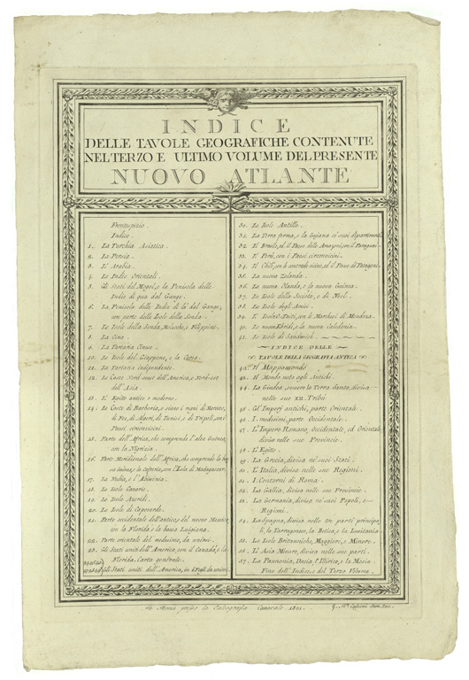 "...DIVISO NELLE SUE PROVINCIE E DELINEATE SULLE ULTIME OSSERVAZIONI. ROMA PRESSO LA CALCOGRAFIA CAMERALE 1796. "NUOVO ATLANTE GEOGRAFICO UNIVERSALE IN TRE TOMI", pubblicato in Roma presso la Calcografia Camerale, opera diretta per l'incisione da Padre G. M. Cassini. Il tomo I è dell'anno 1792, consta di carte 55 precedute da bella allegoria ideata da Tofanelli, incisa da Alessandro Mochetti. Il tomo II è dell'anno 1797, consta di carte 70, precedute da altra allegoria ideata e incisa da Demetrio Dragon. Il tomo III è dell'anno 1801, consta di 57 carte precedute da allegoria di Demetrio Dragon (come nel tomo II). L'opera grandiosa è stata favorita da Papa Pio VI. Redattore, specialmente del tomo I, è il Canonico D. Pietro Bonaccorsi. Del documento fanno parte un testo ed i globi. Testo: "INTRODUZIONE GENERALE ALLO STUDIO DELLA GEOGRAFIA" compendiosa notizia di pagine 34 stampata a Roma nella Calcografia Camerale, divisa in cinque parti: (1792-1801). Parte 1) della Sfera e de' due Globi celeste e terrestre. Parte 2) de' termini generali della Geografia. Parte 3) dell'origine, progressi e stato attuale della medesima. Parte 4) del metodo tenuto per il presente Atlante. Parte 5) delle navigazioni degli antichi fino a noi, e delle scoperte onde per loro mezzo si è arricchita la geografia. Di quest'opera si posseggono due copie, una è mancante del titolo. "GLOBI DELINEATI DAL PADRE GIOVANNI MARIA CASSINI CHIERICO REGOLARE SOMASCO", costruiti per la Biblioteca dell' I.G.M. nell'anno 1928. Il materiale per formare i Globi è stato tracciato dal Cassini, che fu geografo, cartografo e intagliatore su rame. Al numero d'ordine 44 del catalogo è la descrizione del Testo: "INTRODUZIONE GENERALE ALLO STUDIO DELLA GEOGRAFIA" e del "NUOVO ATLANTE GEOGRAFICO UNIVERSALE IN TRE TOMI", editi fra gli anni 1792-1801, contenenti complessivamente 182 tavole artisticamente incise. Le tavole 7, 8, 9, 10, 15 e 17 del tomo I contengono i disegni per formare il GLOBO TERRESTRE. A costruire il GLOBO CELESTE sono servite le tavole 11, 12, 13, 14, 16 e 18 dello stesso tomo I. La periferia dei 12 spicchi è metri 1,06 in ambi i disegni altre caratteristiche comuni alle due sfere sono: linea equatoriale, tropici, eclittica, ampiezza degli spicchi all'equatore 30°. Il Globo terrestre è del 1843, ma prima di tale data esso subì delle varianti, concretate dopo accrescimenti per nuove scoperte geografiche e conseguenti rettifiche, nella attuale rappresentazione. I meridiani sono tracciati, come i paralleli, ogni 10°. Il meridiano iniziale, che passa per l'Isola del Ferro, l'equatore e l'eclittica, sono divisi in gradi. Il sostegno, o castello, è in legno tornito a quattro colonnine presenta sull'orizzonte incollata una carta colle indicazioni dei segni dello zodiaco, delle rose dei venti, e con la divisione di grado in grado. Una tabellina offre la lunghezza del grado del circolo massimo della Sfera terrestre in 14 diverse unità di misura. Il Globo celeste contiene le costellazioni, la via lattea, le stelle fino alla 6^ grandezza e le nebulose è calcolato per l'anno 1792 sui dati degli astronomi "Flamsteed e De la Caille". E' rivestito con spicchi come il Globo terrestre. Le due Sfere ruotano attorno un asse di acciaio che passa per i poli i sostegni sono eguali nei due Globi."