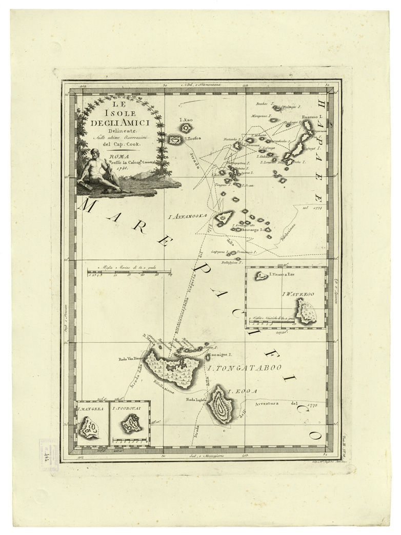 "...DELINEATE SULLE ULTIME OSSERVAZIONI DEL CAP. COOK. ROMA PRESSO LA CALCOG.A CAMERALE 1798. "NUOVO ATLANTE GEOGRAFICO UNIVERSALE IN TRE TOMI", pubblicato in Roma presso la Calcografia Camerale, opera diretta per l'incisione da Padre G. M. Cassini. Il tomo I è dell'anno 1792, consta di carte 55 precedute da bella allegoria ideata da Tofanelli, incisa da Alessandro Mochetti. Il tomo II è dell'anno 1797, consta di carte 70, precedute da altra allegoria ideata e incisa da Demetrio Dragon. Il tomo III è dell'anno 1801, consta di 57 carte precedute da allegoria di Demetrio Dragon (come nel tomo II). L'opera grandiosa è stata favorita da Papa Pio VI. Redattore, specialmente del tomo I, è il Canonico D. Pietro Bonaccorsi. Del documento fanno parte un testo ed i globi. Testo: "INTRODUZIONE GENERALE ALLO STUDIO DELLA GEOGRAFIA" compendiosa notizia di pagine 34 stampata a Roma nella Calcografia Camerale, divisa in cinque parti: (1792-1801). Parte 1) della Sfera e de' due Globi celeste e terrestre. Parte 2) de' termini generali della Geografia. Parte 3) dell'origine, progressi e stato attuale della medesima. Parte 4) del metodo tenuto per il presente Atlante. Parte 5) delle navigazioni degli antichi fino a noi, e delle scoperte onde per loro mezzo si è arricchita la geografia. Di quest'opera si posseggono due copie, una è mancante del titolo. "GLOBI DELINEATI DAL PADRE GIOVANNI MARIA CASSINI CHIERICO REGOLARE SOMASCO", costruiti per la Biblioteca dell' I.G.M. nell'anno 1928. Il materiale per formare i Globi è stato tracciato dal Cassini, che fu geografo, cartografo e intagliatore su rame. Al numero d'ordine 44 del catalogo è la descrizione del Testo: "INTRODUZIONE GENERALE ALLO STUDIO DELLA GEOGRAFIA" e del "NUOVO ATLANTE GEOGRAFICO UNIVERSALE IN TRE TOMI", editi fra gli anni 1792-1801, contenenti complessivamente 182 tavole artisticamente incise. Le tavole 7, 8, 9, 10, 15 e 17 del tomo I contengono i disegni per formare il GLOBO TERRESTRE. A costruire il GLOBO CELESTE sono servite le tavole 11, 12, 13, 14, 16 e 18 dello stesso tomo I. La periferia dei 12 spicchi è metri 1,06 in ambi i disegni altre caratteristiche comuni alle due sfere sono: linea equatoriale, tropici, eclittica, ampiezza degli spicchi all'equatore 30°. Il Globo terrestre è del 1843, ma prima di tale data esso subì delle varianti, concretate dopo accrescimenti per nuove scoperte geografiche e conseguenti rettifiche, nella attuale rappresentazione. I meridiani sono tracciati, come i paralleli, ogni 10°. Il meridiano iniziale, che passa per l'Isola del Ferro, l'equatore e l'eclittica, sono divisi in gradi. Il sostegno, o castello, è in legno tornito a quattro colonnine presenta sull'orizzonte incollata una carta colle indicazioni dei segni dello zodiaco, delle rose dei venti, e con la divisione di grado in grado. Una tabellina offre la lunghezza del grado del circolo massimo della Sfera terrestre in 14 diverse unità di misura. Il Globo celeste contiene le costellazioni, la via lattea, le stelle fino alla 6^ grandezza e le nebulose è calcolato per l'anno 1792 sui dati degli astronomi "Flamsteed e De la Caille". E' rivestito con spicchi come il Globo terrestre. Le due Sfere ruotano attorno un asse di acciaio che passa per i poli i sostegni sono eguali nei due Globi."