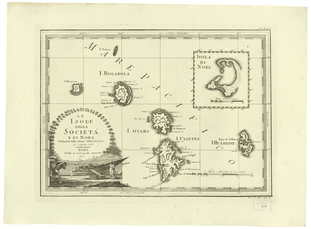 "...DELINEATE SULLE ULTIME OSSERVAZIONI DEL CAPITAN COOK. ROMA PRESSO LA CALCOGRAFIA CAMERALE. 1798. "NUOVO ATLANTE GEOGRAFICO UNIVERSALE IN TRE TOMI", pubblicato in Roma presso la Calcografia Camerale, opera diretta per l'incisione da Padre G. M. Cassini. Il tomo I è dell'anno 1792, consta di carte 55 precedute da bella allegoria ideata da Tofanelli, incisa da Alessandro Mochetti. Il tomo II è dell'anno 1797, consta di carte 70, precedute da altra allegoria ideata e incisa da Demetrio Dragon. Il tomo III è dell'anno 1801, consta di 57 carte precedute da allegoria di Demetrio Dragon (come nel tomo II). L'opera grandiosa è stata favorita da Papa Pio VI. Redattore, specialmente del tomo I, è il Canonico D. Pietro Bonaccorsi. Del documento fanno parte un testo ed i globi. Testo: "INTRODUZIONE GENERALE ALLO STUDIO DELLA GEOGRAFIA" compendiosa notizia di pagine 34 stampata a Roma nella Calcografia Camerale, divisa in cinque parti: (1792-1801). Parte 1) della Sfera e de' due Globi celeste e terrestre. Parte 2) de' termini generali della Geografia. Parte 3) dell'origine, progressi e stato attuale della medesima. Parte 4) del metodo tenuto per il presente Atlante. Parte 5) delle navigazioni degli antichi fino a noi, e delle scoperte onde per loro mezzo si è arricchita la geografia. Di quest'opera si posseggono due copie, una è mancante del titolo. "GLOBI DELINEATI DAL PADRE GIOVANNI MARIA CASSINI CHIERICO REGOLARE SOMASCO", costruiti per la Biblioteca dell' I.G.M. nell'anno 1928. Il materiale per formare i Globi è stato tracciato dal Cassini, che fu geografo, cartografo e intagliatore su rame. Al numero d'ordine 44 del catalogo è la descrizione del Testo: "INTRODUZIONE GENERALE ALLO STUDIO DELLA GEOGRAFIA" e del "NUOVO ATLANTE GEOGRAFICO UNIVERSALE IN TRE TOMI", editi fra gli anni 1792-1801, contenenti complessivamente 182 tavole artisticamente incise. Le tavole 7, 8, 9, 10, 15 e 17 del tomo I contengono i disegni per formare il GLOBO TERRESTRE. A costruire il GLOBO CELESTE sono servite le tavole 11, 12, 13, 14, 16 e 18 dello stesso tomo I. La periferia dei 12 spicchi è metri 1,06 in ambi i disegni altre caratteristiche comuni alle due sfere sono: linea equatoriale, tropici, eclittica, ampiezza degli spicchi all'equatore 30°. Il Globo terrestre è del 1843, ma prima di tale data esso subì delle varianti, concretate dopo accrescimenti per nuove scoperte geografiche e conseguenti rettifiche, nella attuale rappresentazione. I meridiani sono tracciati, come i paralleli, ogni 10°. Il meridiano iniziale, che passa per l'Isola del Ferro, l'equatore e l'eclittica, sono divisi in gradi. Il sostegno, o castello, è in legno tornito a quattro colonnine presenta sull'orizzonte incollata una carta colle indicazioni dei segni dello zodiaco, delle rose dei venti, e con la divisione di grado in grado. Una tabellina offre la lunghezza del grado del circolo massimo della Sfera terrestre in 14 diverse unità di misura. Il Globo celeste contiene le costellazioni, la via lattea, le stelle fino alla 6^ grandezza e le nebulose è calcolato per l'anno 1792 sui dati degli astronomi "Flamsteed e De la Caille". E' rivestito con spicchi come il Globo terrestre. Le due Sfere ruotano attorno un asse di acciaio che passa per i poli i sostegni sono eguali nei due Globi."