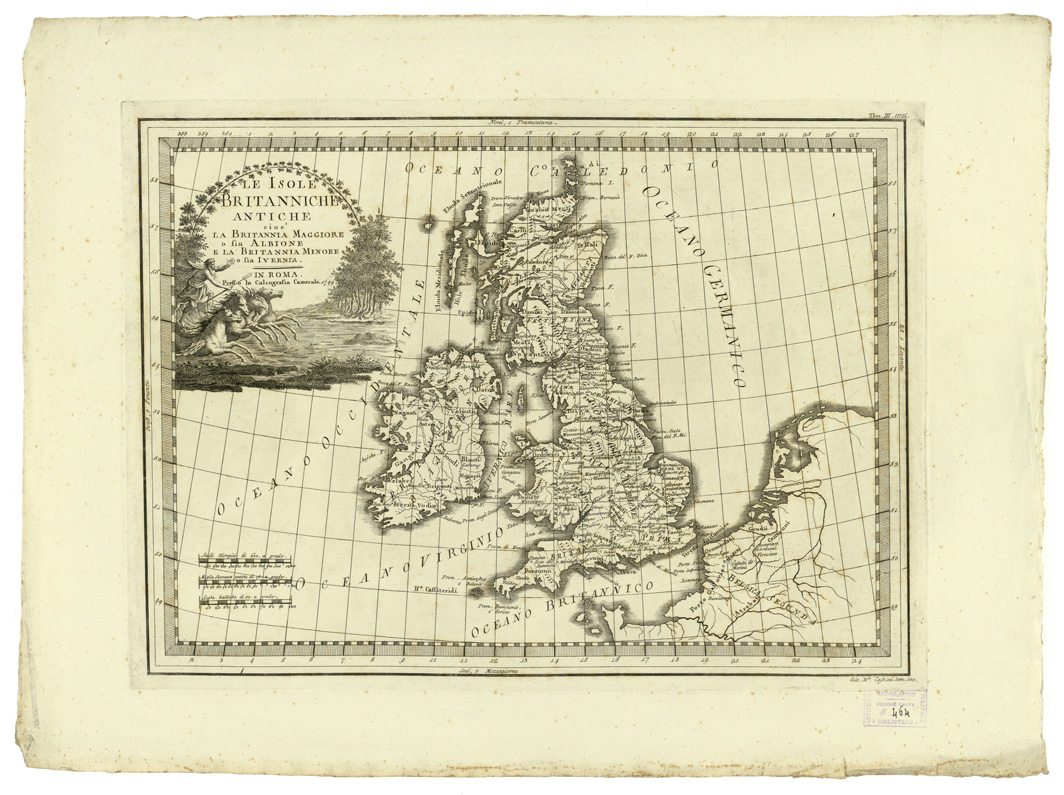 "...CIOE' LA BRITANNIA MAGGIORE O SIA ALBIONE E LA BRITANNIA MINORE O SIA IVERNIA. IN ROMA. PRESSO LA CALCOGRAFIA CAMERALE 1799. "NUOVO ATLANTE GEOGRAFICO UNIVERSALE IN TRE TOMI", pubblicato in Roma presso la Calcografia Camerale, opera diretta per l'incisione da Padre G. M. Cassini. Il tomo I è dell'anno 1792, consta di carte 55 precedute da bella allegoria ideata da Tofanelli, incisa da Alessandro Mochetti. Il tomo II è dell'anno 1797, consta di carte 70, precedute da altra allegoria ideata e incisa da Demetrio Dragon. Il tomo III è dell'anno 1801, consta di 57 carte precedute da allegoria di Demetrio Dragon (come nel tomo II). L'opera grandiosa è stata favorita da Papa Pio VI. Redattore, specialmente del tomo I, è il Canonico D. Pietro Bonaccorsi. Del documento fanno parte un testo ed i globi. Testo: "INTRODUZIONE GENERALE ALLO STUDIO DELLA GEOGRAFIA" compendiosa notizia di pagine 34 stampata a Roma nella Calcografia Camerale, divisa in cinque parti: (1792-1801). Parte 1) della Sfera e de' due Globi celeste e terrestre. Parte 2) de' termini generali della Geografia. Parte 3) dell'origine, progressi e stato attuale della medesima. Parte 4) del metodo tenuto per il presente Atlante. Parte 5) delle navigazioni degli antichi fino a noi, e delle scoperte onde per loro mezzo si è arricchita la geografia. Di quest'opera si posseggono due copie, una è mancante del titolo. "GLOBI DELINEATI DAL PADRE GIOVANNI MARIA CASSINI CHIERICO REGOLARE SOMASCO", costruiti per la Biblioteca dell' I.G.M. nell'anno 1928. Il materiale per formare i Globi è stato tracciato dal Cassini, che fu geografo, cartografo e intagliatore su rame. Al numero d'ordine 44 del catalogo è la descrizione del Testo: "INTRODUZIONE GENERALE ALLO STUDIO DELLA GEOGRAFIA" e del "NUOVO ATLANTE GEOGRAFICO UNIVERSALE IN TRE TOMI", editi fra gli anni 1792-1801, contenenti complessivamente 182 tavole artisticamente incise. Le tavole 7, 8, 9, 10, 15 e 17 del tomo I contengono i disegni per formare il GLOBO TERRESTRE. A costruire il GLOBO CELESTE sono servite le tavole 11, 12, 13, 14, 16 e 18 dello stesso tomo I. La periferia dei 12 spicchi è metri 1,06 in ambi i disegni altre caratteristiche comuni alle due sfere sono: linea equatoriale, tropici, eclittica, ampiezza degli spicchi all'equatore 30°. Il Globo terrestre è del 1843, ma prima di tale data esso subì delle varianti, concretate dopo accrescimenti per nuove scoperte geografiche e conseguenti rettifiche, nella attuale rappresentazione. I meridiani sono tracciati, come i paralleli, ogni 10°. Il meridiano iniziale, che passa per l'Isola del Ferro, l'equatore e l'eclittica, sono divisi in gradi. Il sostegno, o castello, è in legno tornito a quattro colonnine presenta sull'orizzonte incollata una carta colle indicazioni dei segni dello zodiaco, delle rose dei venti, e con la divisione di grado in grado. Una tabellina offre la lunghezza del grado del circolo massimo della Sfera terrestre in 14 diverse unità di misura. Il Globo celeste contiene le costellazioni, la via lattea, le stelle fino alla 6^ grandezza e le nebulose è calcolato per l'anno 1792 sui dati degli astronomi "Flamsteed e De la Caille". E' rivestito con spicchi come il Globo terrestre. Le due Sfere ruotano attorno un asse di acciaio che passa per i poli i sostegni sono eguali nei due Globi."
