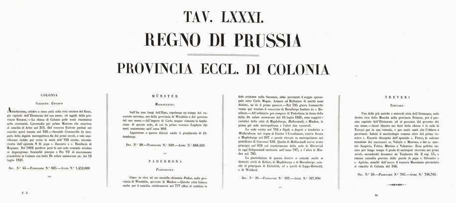 "L'ORBE CATTOLICO OSSIA ATLANTE GEOGRAFICO STORICO ECCLESIASTICO OPERA DEL COMMENDATORE GIROLAMO PETRI OFFICIALE MINUTANTE NELLA SEGRETERIA DI STATO, ROMA TIPOGRAFIA DELLA REVERENDA CAMERA APOSTOLICA 1859. Questa pregievole opera geografica consta di 135 fogli incisi finemente su rame e acquerellati. Il primo disegno è un'allegoria sulla "Religione e potenza del Papato", tavola artisticamente delineata da Tomaso Minardi, incisa da M. Ang. Martini sotto all'immagine è scritto: "ECCLESIA DEI VIVI COLUMNA ET FIRMAMENTUM VERITATIS". Segue la "DESCRIZIONE DEL GLOBO" in 138 tavole colorate e divise in circoscrizioni, province, diocesi, patriarcati. Le longitudini sono riferite al meridiano di Parigi. L'Atlante è in fogli sciolti."