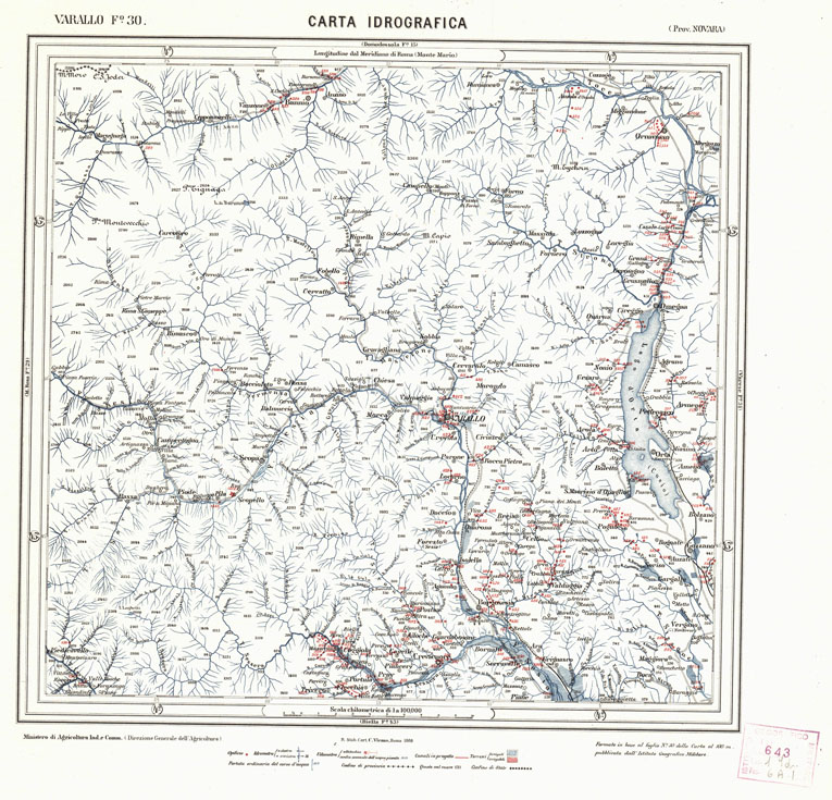 "Pubblicata per cura del Ministero di Agricoltura Industria e Commercio. Direzione Generale dell'Agricoltura. In basso al centro la spiegazione dei segni convenzionali. In basso a destra la dicitura "Formato in base al foglio della carta al 100/m. pubblicata dall'I.G.M. ". R. Stab. Cart. C. Virano, Roma 1889."