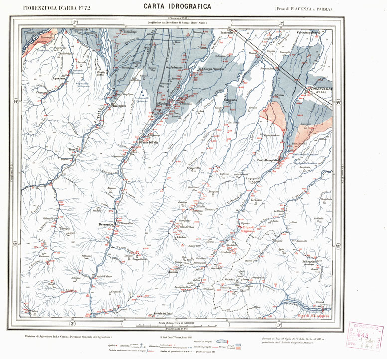 "Pubblicata per cura del Ministero di Agricoltura Industria e Commercio. Direzione Generale dell'Agricoltura. In basso al centro la spiegazione dei segni convenzionali. In basso a destra la dicitura "Formato in base al foglio della carta al 100/m. pubblicata dall'I.G.M. ". R. Stab. Cart. C. Virano, Roma 1887."