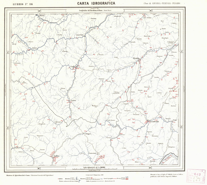 "Pubblicata per cura del Ministero di Agricoltura Industria e Commercio. Direzione Generale dell'Agricoltura. In basso al centro la spiegazione dei segni convenzionali. In basso a destra la dicitura "Formato in base al foglio della carta al 100/m. pubblicata dall'I.G.M. ". R. Stab. Cart. C. Virano, Roma 1889."
