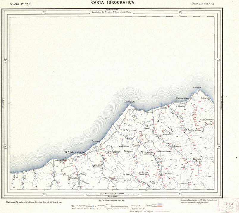 "Pubblicata per cura del Ministero di Agricoltura Industria e Commercio. Direzione Generale dell'Agricoltura. In basso al centro la spiegazione dei segni convenzionali. In basso a destra la dicitura "Formato in base al foglio della carta al 100/m. pubblicata dall'I.G.M. ". Stab. Cart. Bruno e Salomone, Roma 1890."