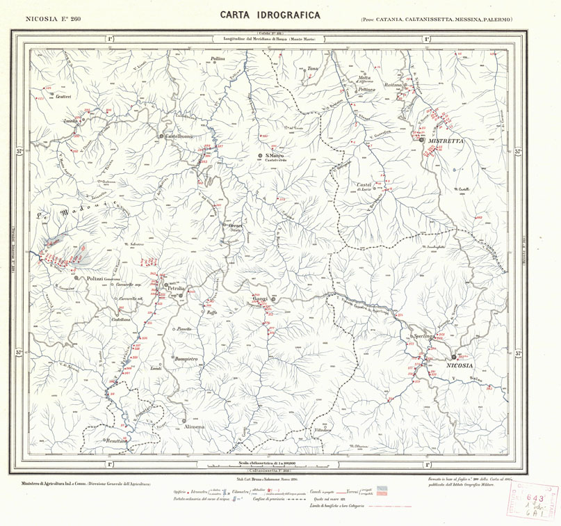 "Pubblicata per cura del Ministero di Agricoltura Industria e Commercio. Direzione Generale dell'Agricoltura. In basso al centro la spiegazione dei segni convenzionali. In basso a destra la dicitura "Formato in base al foglio della carta al 100/m. pubblicata dall'I.G.M. ". Stab. Cart. Bruno e Salomone, Roma 1890."