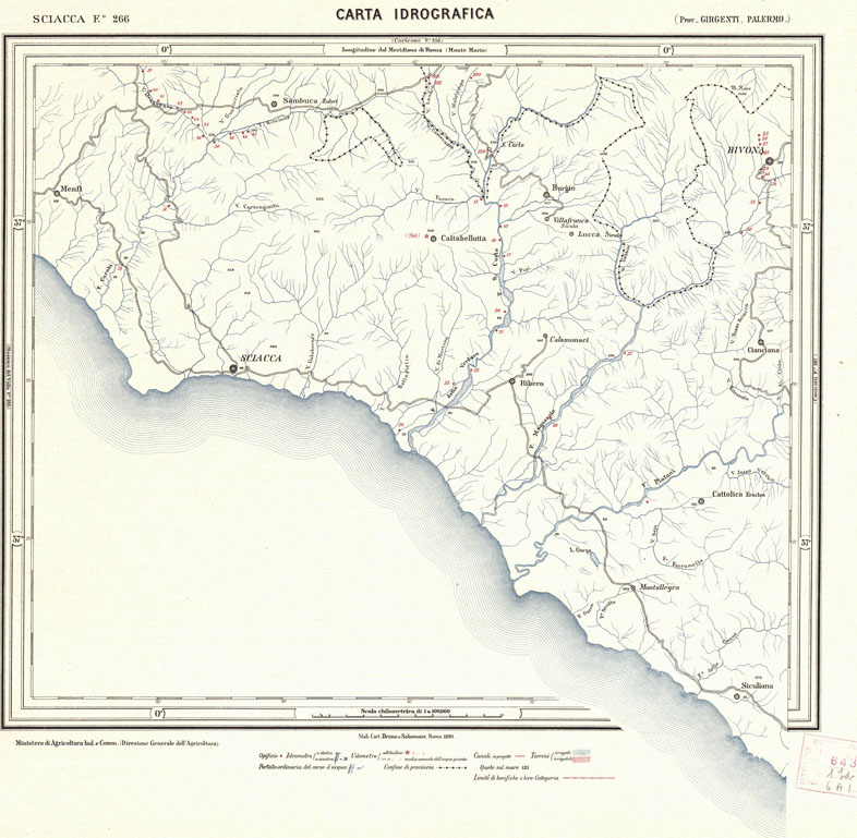 "Pubblicata per cura del Ministero di Agricoltura Industria e Commercio. Direzione Generale dell'Agricoltura. In basso al centro la spiegazione dei segni convenzionali. In basso a destra la dicitura "Formato in base al foglio della carta al 100/m. pubblicata dall'I.G.M. ". Stab. Cart. Bruno e Salomone, Roma 1890."