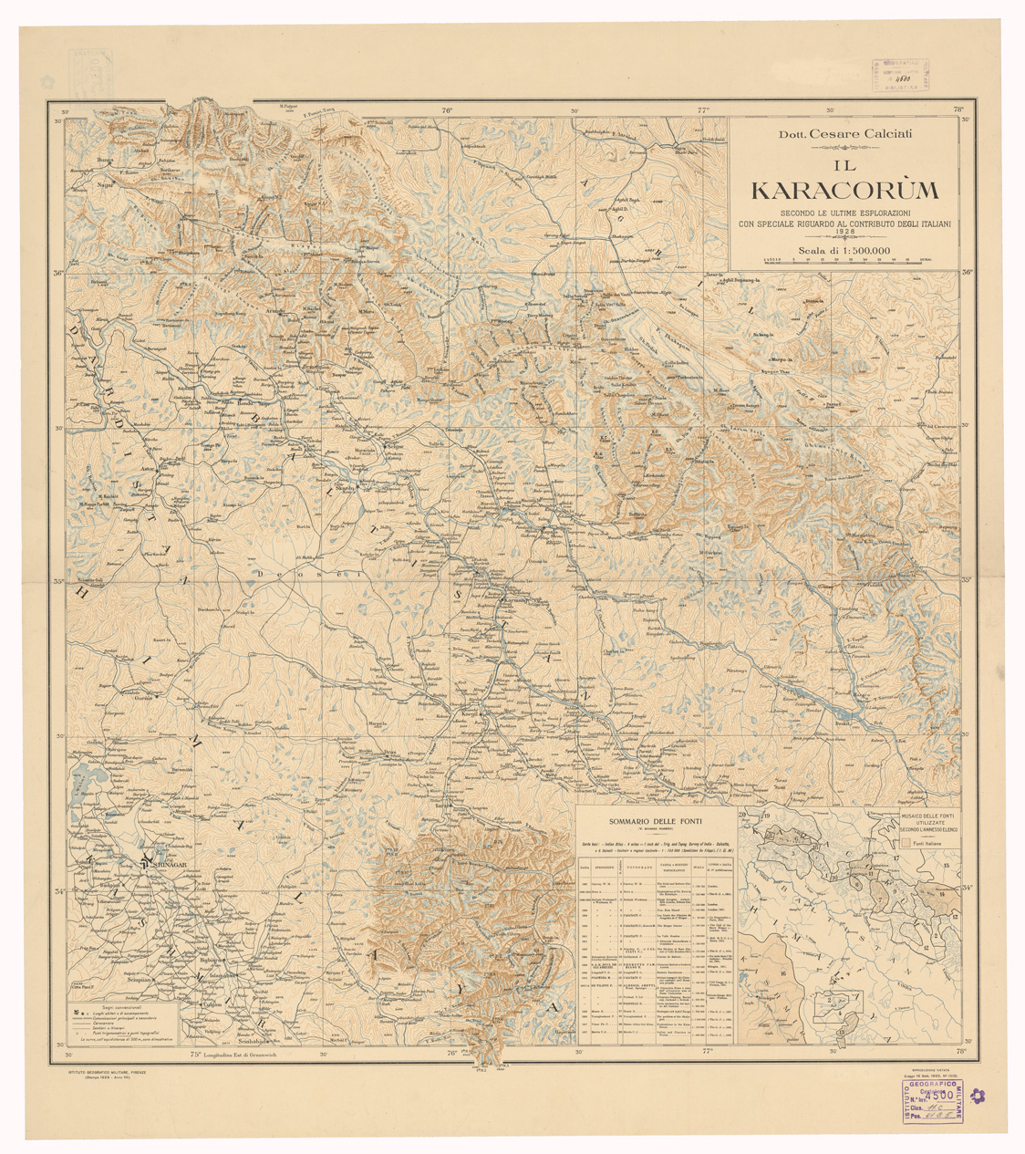 "Il Karacorum, secondo le splorazioni ultime con speciale riguardo al contributo degli italiani. Autore Cesare Calciati. Istituto Geografico Militare (stampa 1929)."