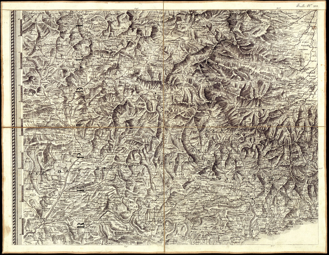 "...DEPUIS LE PASSAGE DU VAR LE 29 SEPT. 1792 V. S. JUSQU'A L'ENTREE DES FRANCAIS A ROME LE 22 PLUVIOSE AN 6.m REP. AIN, AVEC LES LIMITS ET DIVISIONS DES NOUVELLES REPUBLIQUES. PAR BACLER D'ALBE INGENIEUR GEOGRAPHE ATTACHE PENDANT TOUTE LA GUERRE AU GEN. BONAPARTE EN QUALITE DE CHEF DE SON BUREAU TOPOGRAPHIQUE. A PARIS CHEZ L'AUTEUR CHEF DES INGENIEURS GEOGRAPHES, ECC. SEGUE IN BASSO A DESTRA DEL TITOLO: GRAVEE PAR LES FRERES BORDIGA. E' la famosa carta costruita dal capo dell'Ufficio topografico costituito presso di sè dal Gen. Bonaparte, mentre era al Comando dell'Armata francese in Italia. Essa è basata sul materiale raccolto a Milano dal "Bureau" topografico e fu pubblicata parte in quella città e parte a Parigi presso il Depot de la guerre. Si compone di trenta fogli montati su tela e contenuti in buste, estendentisi a tutta l'Italia settentrionale e centrale, parte della Francia (Tolone-Besancon), l'intera Svizzera, parte della Germania (Monaco) e dell'Austria (Vienna), indi la Dalmazia e la Grecia. Il foglio N° I contiene le note geografiche circa la costruzione e il materiale impiegato per la carta. Il foglio N° 26 reca il titolo. Il foglio N° 28 contiene le scale grafiche e la leggenda dei segni convenzionali. Il foglio N° 30 è interamente dedicato a un quadro cronologico degli avvenimenti militari dal 1792 al 1800. La carta rappresenta l'orografia col tratteggio a luce obliqua. Distingue le città principali, le fortezze, i villaggi, le poste, paludi e boschi, strade (4 classi), confini, miniere e sorgenti minerali, ecc., e reca tutte le indicazioni di carattere militare circa le posizioni, marce, luoghi di combattimento, trincee, ecc. A questa prima parte della carta ne seguì una seconda in 22 fogli comprendente i Reami di Napoli, Sicilia e Sardegna. (Cnfr. Mori A., La cartografia ufficiale in Italia e l'I.G.M., 1922, pp. 35-37). Le dimensioni riportate sono complessive dell'intera carta."