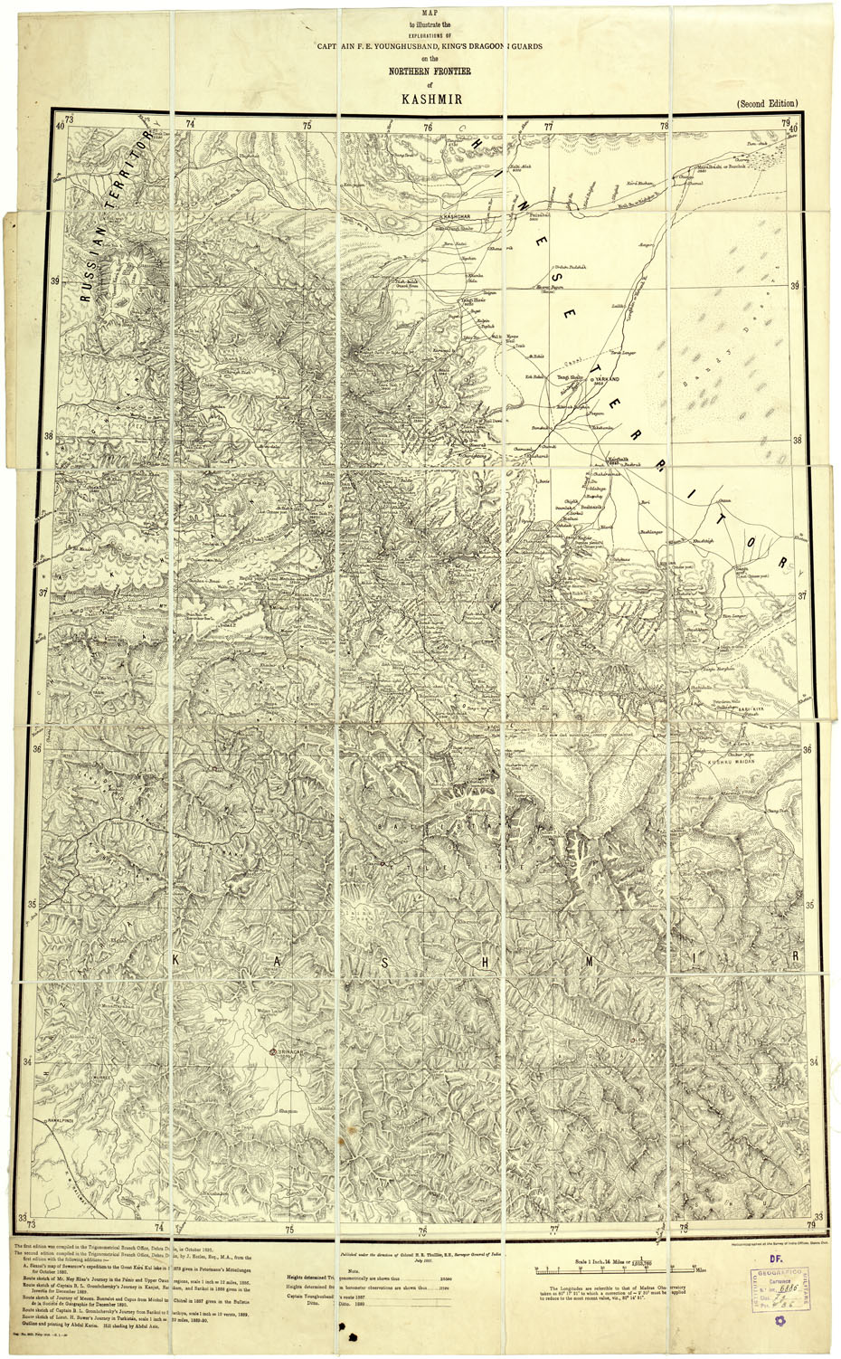 INDIA BRITANNICA - MAP TO ILLUSTRATE THE EXPLORATIONS OF CAPTAIN F. E. YOUNGHSBAND (COPIA SU TELA)