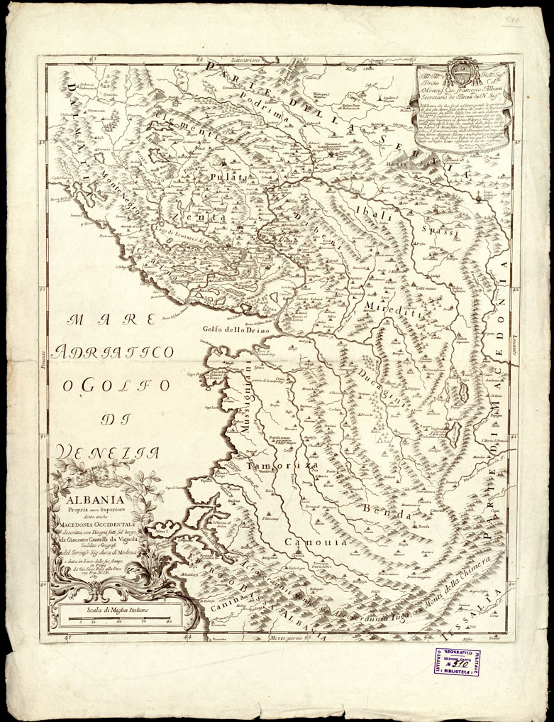 ALBANIA PROPRIO OVVERO SUPERIORE DETTA ANCHE MACEDONIA OCCIDENTALE DESCRITTA DA GIACOMO CANTELLI DA VIGNOLA (CALCOGRAFIA CAMERALE)