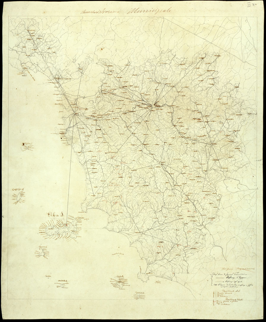 "Questa carta nella proporzione al vero di 1:400 mila è una riduzione di quella che L'Egregio Astronomo G. Inghirami delle Scuole Pie ha recentemente pubblicata col titolo di CARTA GEOMETRICA DELLA TOSCANA. La riduzione è stata eseguita con eccellente Pantografo, sotto gli occhi e sull'originale inedito dell'autore e con l'appoggio di quasi tutti i di lui punti trigonometrici, che si è avuto cura di collocare con diligenza al rispettivo loro luogo prima di dar mano al lavoro. La carta preledato G. Inghirami è nella preparazione di 1:200 mila ed è stata costruita sopra una rete di 2505 triangoli di primo ordine attestati a 767 punti trigonometrici. Le posizioni Geografiche sono dipendenti da quelle dell'osservatorio delle Scuole Pie di Firenze, a cui le più recenti osservazioni danno 43°46'41" Lat. Boreale e 8°45'0" Long. ceduta dalla Reale Specola di Parigi. L'orientamento è stato determinato con molte osservazioni d'Azimuth sui punti trigonometrici visibili dal predetto osservatorio. La proiezione è quella Bonne il meridiano medio cade sugli 8°59'50", e il parallelo medio sui 43°0'0". Il valore di popolazione è assegnato a ciascun località dietro le risultanze di autentici documenti. I Capiluogo di Comunità sono distinti con caretteristiche particolari: quelli suburbani alle città di Siena, Pistoia cadono per la prima sulle località di Monistero Valli e per la seconda sulle altre di Saternana, Val di Bure, Piavica e San Pantaleo. Le stazioni postali sono quelle in attuale attività. Le dogane di frontiera sono considerate di 1° classe quelle con doganiere e di seconda quelle con solo le guardie di finanza, in seguito di precise indicazioni. La linea dei posti armati lungo il litorale ed Isole è stabilita dietro delle accurate osservazioni di prima classe sono i posti che difendano un Porto di seconda quelli che proteggano uno Scalo di terza quelli che osservano le spiagge. I luoghi di Fusione ed altre lavorazioni di Ferro e Rame sono fissati dopo esatte ricerche. Le località, e le classificazioni di Bagni ed acque come pure della maggior parte dei Minerali sono contrassegnate colle indicazioni del Prof. G. Giulj. Le strade sono tracciate nella qualità colle modifiche più recenti originalmente verificate."