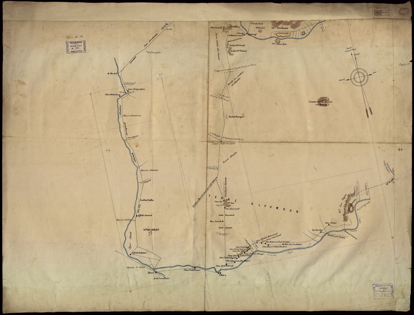 "Eseguita da ufficiali dello Stato Maggiore Egiziano d'ordine di Rascid Pascià riprodotta in italiano per cura del Corpo di Stato Maggiore 1° Reparto (1888). La carta consta di quattro fogli a stampa policroma. L'orografia rappresentata dimostrativamente con curve di livello e tratteggio, l'idrografia in azzurro, le scritture, strade e centri abitati in nero. Riproduzione in fotolitografia. La carta si riattacca a sud con la carta delle regioni Ghedaref, Daka e Gallabat (ved. N°797 d'inventario) alla stessa scala a e est con la carta delle regioni fra Massaua e il Barka."