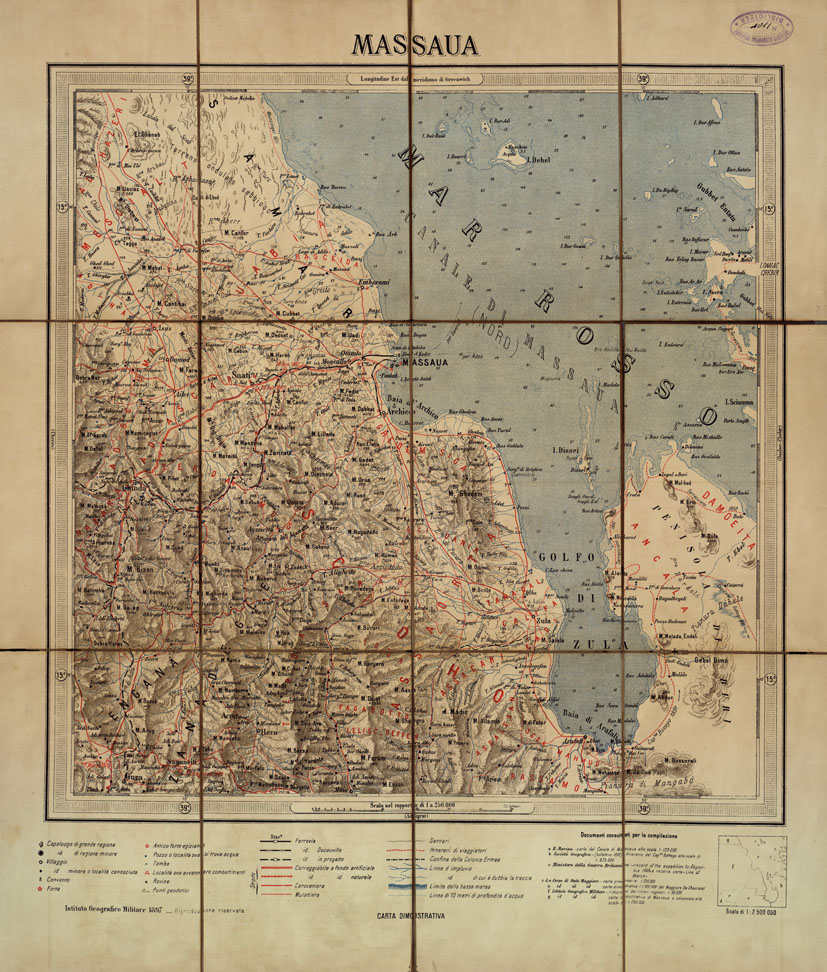 "Fogli Massaua, Anfila, Adigrat, Cheren, Cassala, Adua, Daalac Chebir della carta al 400.000 (ved. N°41 d'ordine, N°603 d'inventario) dei quali fu fatta la riproduzione alla scala di 1:250.000. La riproduzione non fu per altro continuata per il rimanente della carta. I fogli sono montati su tela e contenuti in una busta."