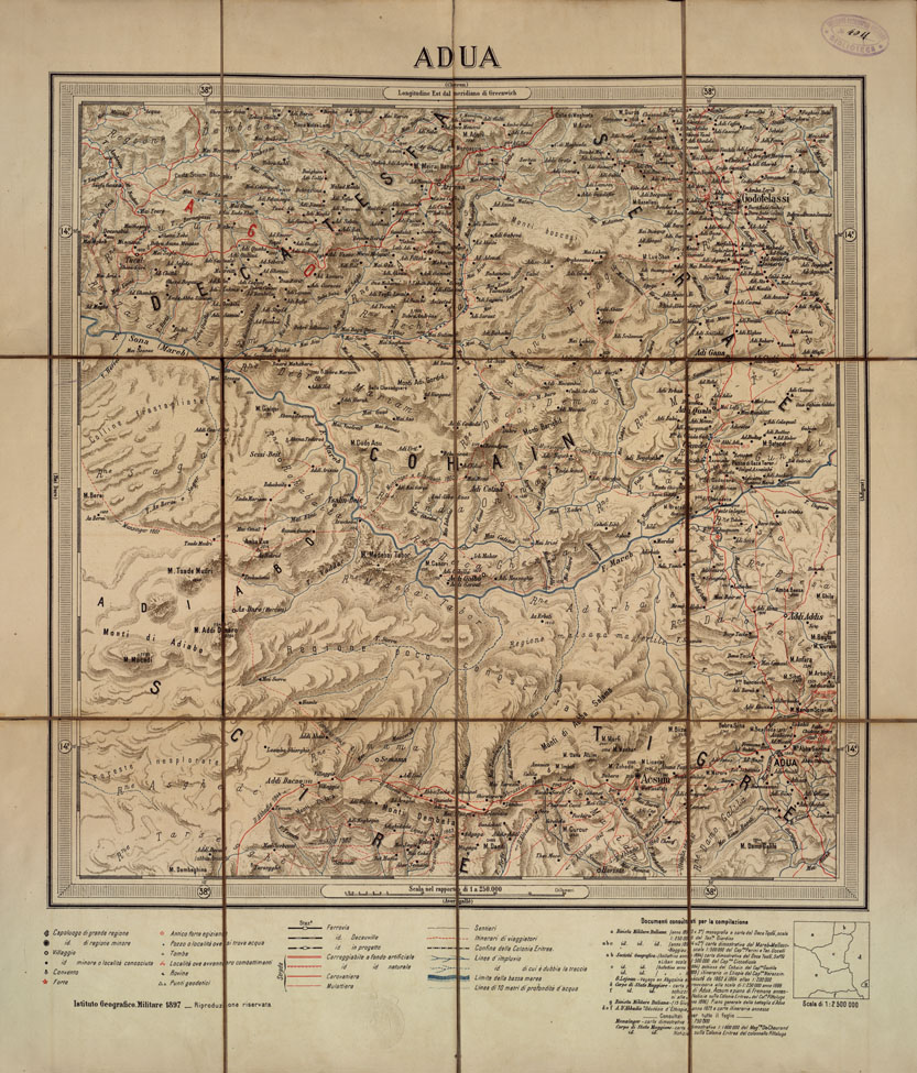 "Fogli Massaua, Anfila, Adigrat, Agordat, Cheren, Cassala, Adua, Daalac Chebir della carta al 400.000 (ved. N°41 d'ordine, N°603 d'inventario) dei quali fu fatta la riproduzione alla scala di 1:250.000. La riproduzione non fu per altro continuata per il rimanente della carta. I fogli sono montati su tela e cintenuti in una busta."