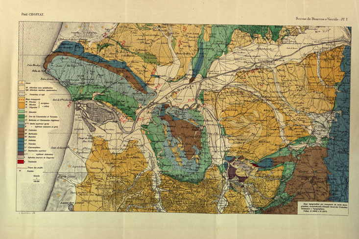"Servicos Geologicos Lisboa. Autore Paul Choffat. Stampa in policroma. Planimetrica. Base Topographica por transporte da carta chorographica levantada pela Direcçao Geral dos Trabalhos Geodesicos e Topographicos."