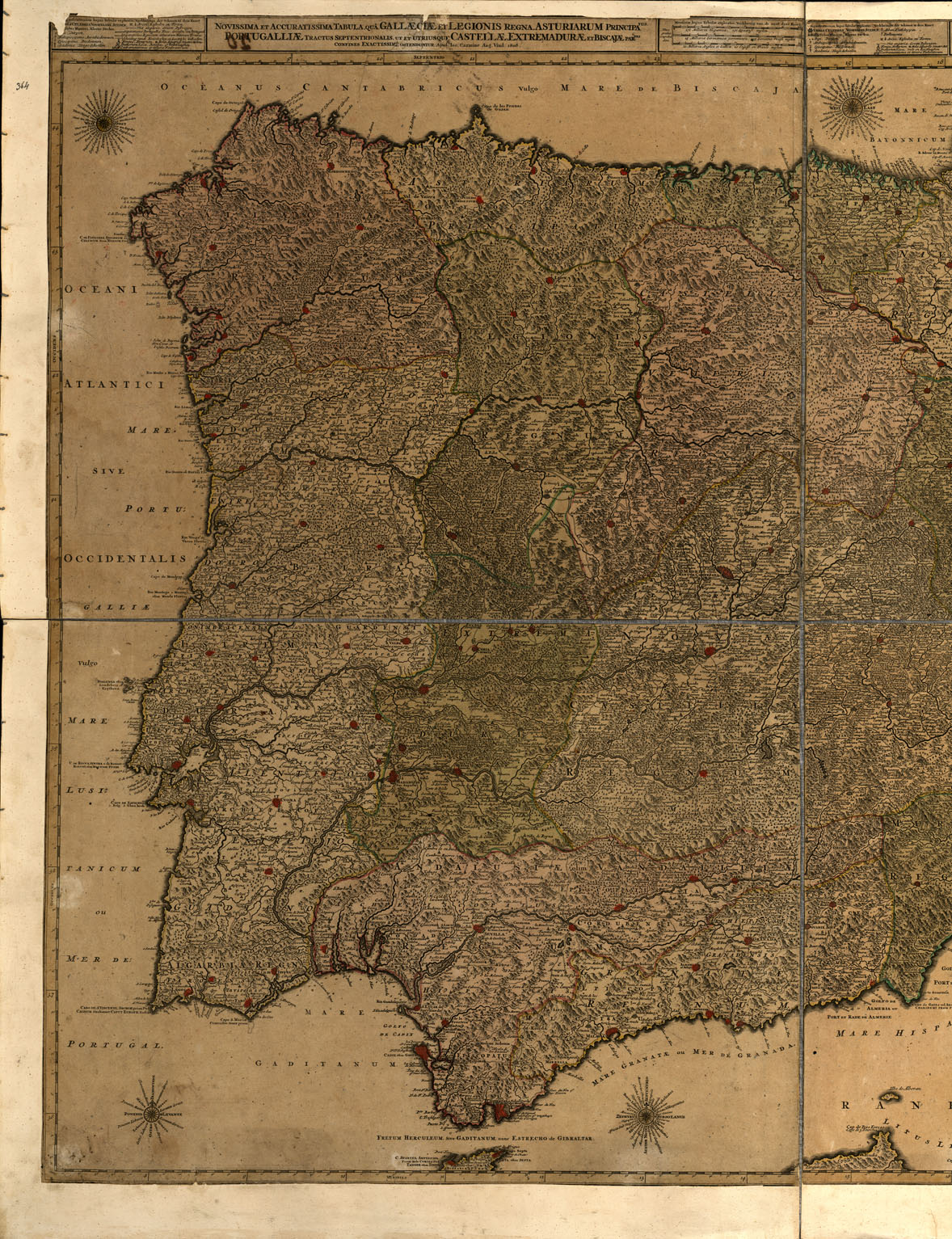 "Austuriarum Principatus Portugalliae tractus ut et utrinsque Castellae, Extremadurae et Biscajae partes. Confine Exactissime ostenduntur apud Jos Carmine Aug. Vind. 1808. Exactissima et Postomnes Alias nunc demumedita tabula continens perfectam descriptionem regnorum Arragoniae et Navarrae, principatas Cataloniae, nec non partium conterminarum, Biscajae utriuspue Castellae, Ac Valentiae. Scala grafica in tre differenti misure antiche corrispondenti al rapporto di 1:1.133.700 circa. (Senza località di pubblicazione). Jos Carmine. Si compone di quattro fogli riuniti, due dei quali portano i due titoli soprariportati. Rappresenta il Portogallo la Spagna con le isole Baleari ed una striscia di Francia. E' stampata in nero da incisione sul rame e colorata a mano con tinte diverse per la distinsione delle varie provincie. Le città principali sono colorate a mano in rosso. E' densa di nomi e di particolari così da togliere ogni chiarezza al disegno. Le catene montuose sono rappresentate prospetticamente. Le strade sono segnate in abbondanza ma rese poco evidenti. Anche le foreste sono largamente rappresentate. E' redatta in latino parte della toponomastica. Nell'angolo sud-est è posta una tabella contenente la divisione geografica della Spagna e Portogallo, scritta in lingua francese ed olandese. Origine della longitudine è il meridiano dell'Isola di Ferro."