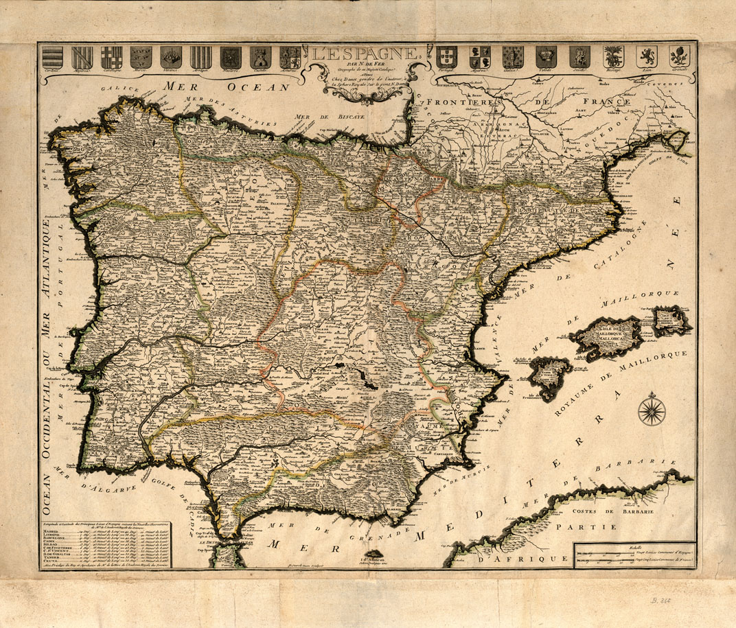"Par N. De Fer Geographe de sa Majesté Catolique. A Paris chez Danet gendre de l'auteur à la Sphere Royale sur le pont N. Dame. Comprende la Spagna e il Portogallo. Deriva da incisione su rame, eseguita da P. Starcle ed è stampata in color nero I confini amministrativi e politici sono colorati a mano. Le cate montuose sono rappresentate da gruppi di piccoli coni ombreggiati a tratteggio. E' priva di rete stradale. Ricca di nomi, è redatta in lingua francese ed anche la toponomastica è prevalentemente in detta lingua. Manca di reticolato geografico, però in una piccola tabella posta nell'angolo sud-ovest del foglio sono segnate le longitudini delle località più importanti della Spagna desunte delle osservazioni dell'Accademia Reale delle Scienze. Nei margini destro, sinistro e superiore, sono incisi 15 stemmi delle principali città."