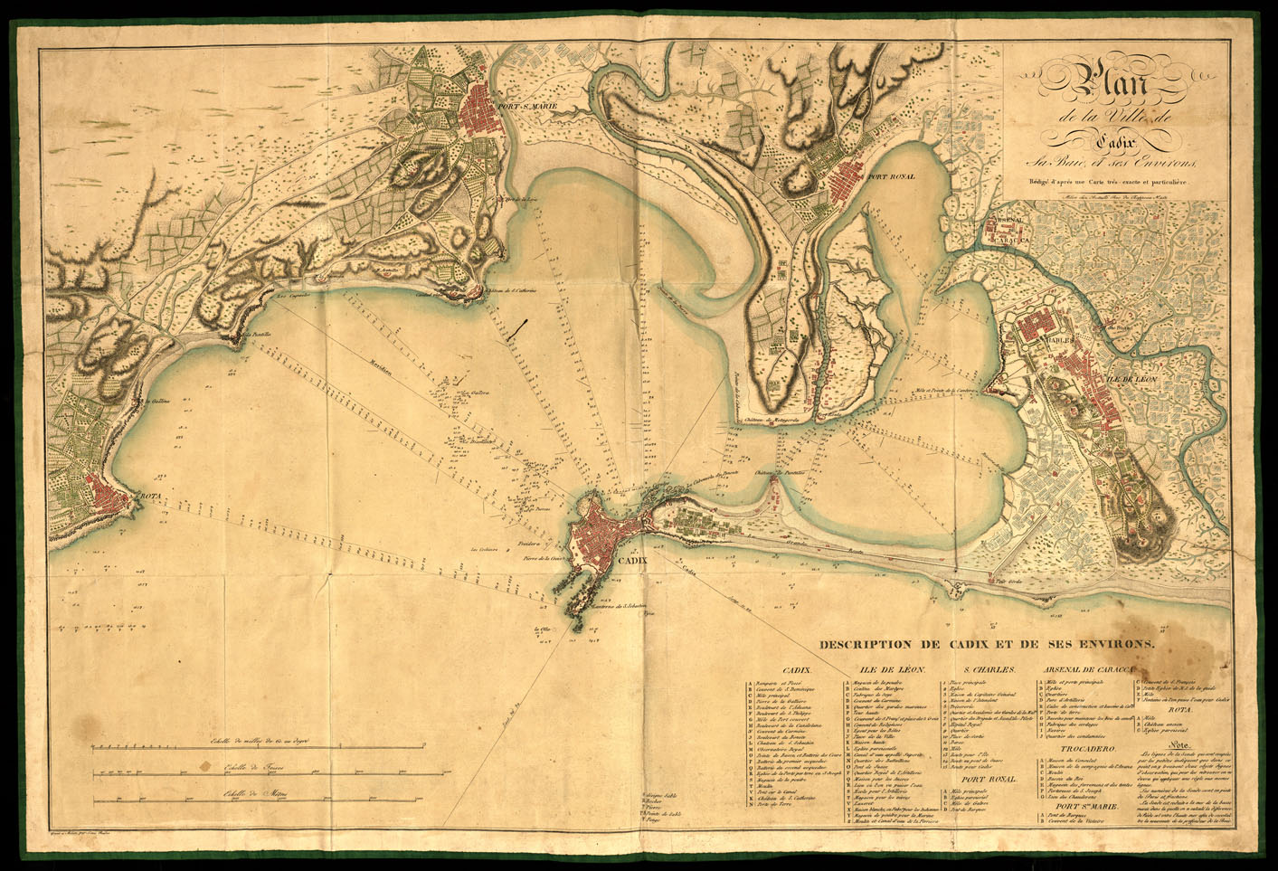 "Sa Baie et ses environs, redigé d'après une Carte très Exacte et particulière. Milan chez Bettalli Rue du Chappeau N. 4031. Bellisima incsione in rame in un solo foglio montato su tela, eseguita da Louis Radoz in Milano. Contiene tre scale grafiche, 7000 metri sono rappresentati da 226 mm. Il rapporto è di 1:30.973 circa. Nell'angolo sud-est è una leggenda coi nomi delle piazze e delle strade. Oltre le città di Cadice contiene: l'Ile de Leon, St. Charles, l'Arsenal de Caracca, Port Royal, Port S.te Marie, Rota. Nel mare sono scandagli il cui valore è espresso in piedi di Parigi. Il disegno è acquerellato. Ciglioni e colline sono rappresentati con artistico tratteggio a luce zenitale."
