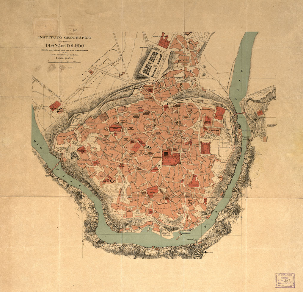 "Edizione provvisoria dalla Sres. Asambleistas della Unione Geodetica e Geofisica. E' una pianta della città di Toledo: Edizione in policroma: rosa per i fabbricati nero per le scritture, per le strade, per l'altimetrica rappresentata a curve di livello e tratteggio con equidistanza di m. 5 azzurro per le acque. Vi sono segnate frequenti quote altimetriche."