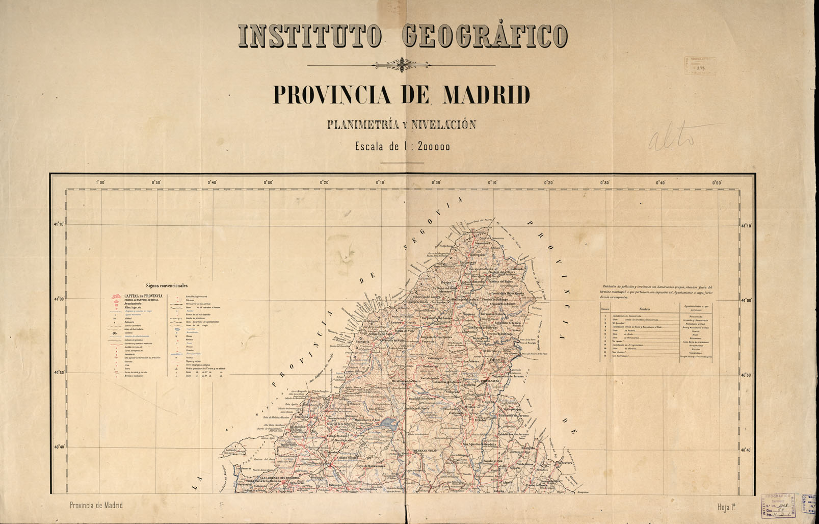 "Madrid. - Istituto Geografico y Estadistico. Si compone di due fogli. Il campo disegnato occupa solamente il centro dei fogli, il rimanente spazio è coperto da indicazioni varie. Il sistema di proiezione adottato è quello di Tissot. E' stampata in edizione policroma da fotoincisione in rame. L'orografia è rappresentata da curve di livello in bistro contrassegnate da quote (equidistanza m.100) i centri abitati e le strade principali sono in color rosso le ferrovie, le scritture ed i confini amministrativi in nero le acque in azzurro. E' una carta amministrativa."