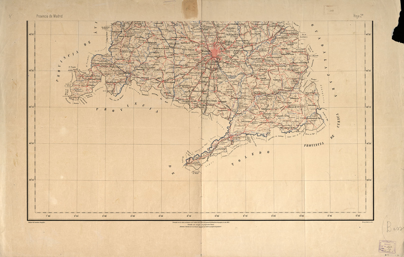 "Madrid. - Istituto Geografico y Estadistico. Si compone di due fogli. Il campo disegnato occupa solamente il centro dei fogli, il rimanente spazio è coperto da indicazioni varie. Il sistema di proiezione adottato è quello di Tissot. E' stampata in edizione policroma da fotoincisione in rame. L'orografia è rappresentata da curve di livello in bistro contrassegnate da quote (equidistanza m.100) i centri abitati e le strade principali sono in color rosso le ferrovie, le scritture ed i confini amministrativi in nero le acque in azzurro. E' una carta amministrativa."