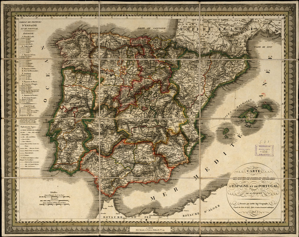 "Par Ch. Picquet. Vienna. - Lapie, 1813. Consta di un foglio legato su tela a stacchi. E' stampata in nero da incisione su rame della ditta Artaria e Compag. di Vienna. I confini amministrativi e politici sono colorati a mano. L'orografia è rappresentata con tratteggio a luce zenitale. La rete stradale, molto estesa, contiene le distanze fra i luoghi abitati, espresse in leghe di Spagna, che sono lunghe m. 9349,75, pari a leghe 17,5 al grado. La carta è stata compilata dall' Ing. geografo Lapie sulla base delle carte di Lopez, Tofino ed altri documenti autentici. La toponomastica è in parte francese e in parte spagnola. Il meridiano di origine della longitudine è quello di Parigi. Nel lato ovest è una tavola , redatta in francese, con i nomi delle provincie della Spagna e del Portogallo."