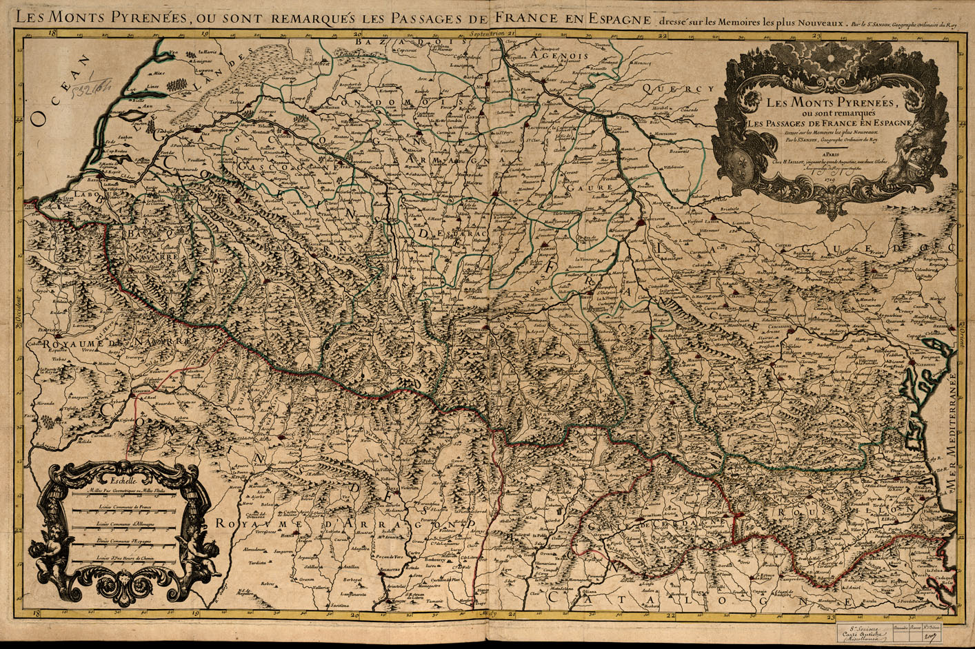 "Ou sont remarques les passeges de France en Espagne. Autore Sanson. Editore H. Iaillot - Paris. Incisione con linee di confine colorate a acquerello. Rappresentazione orografica prospettica. Grafia in lingua Franco-Spagnola"