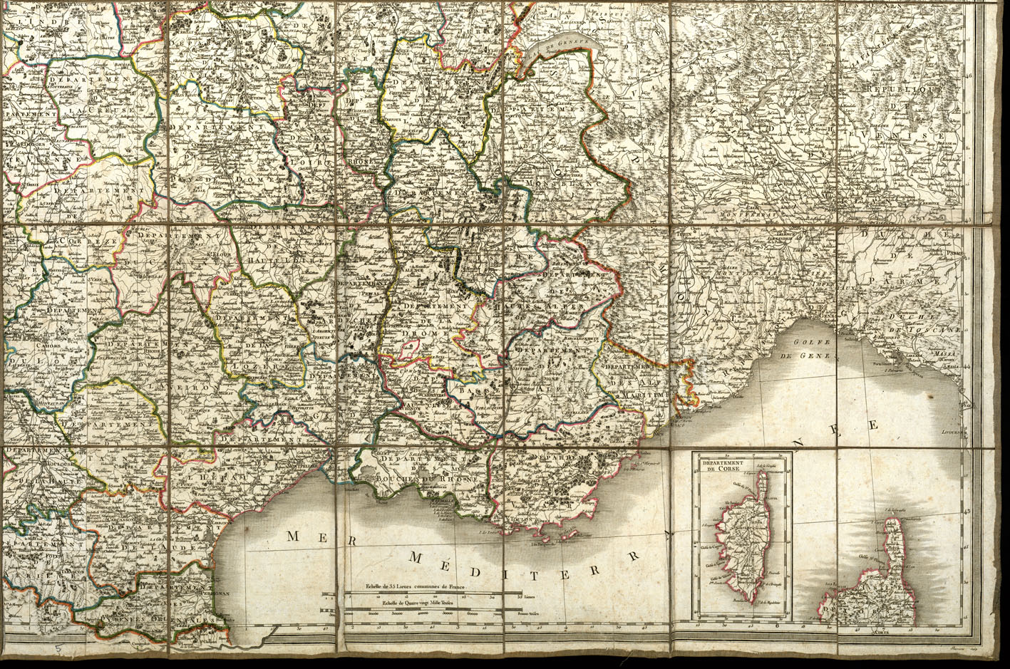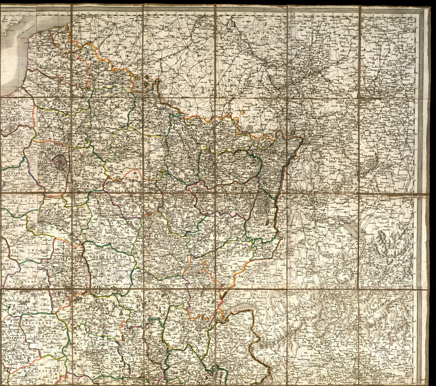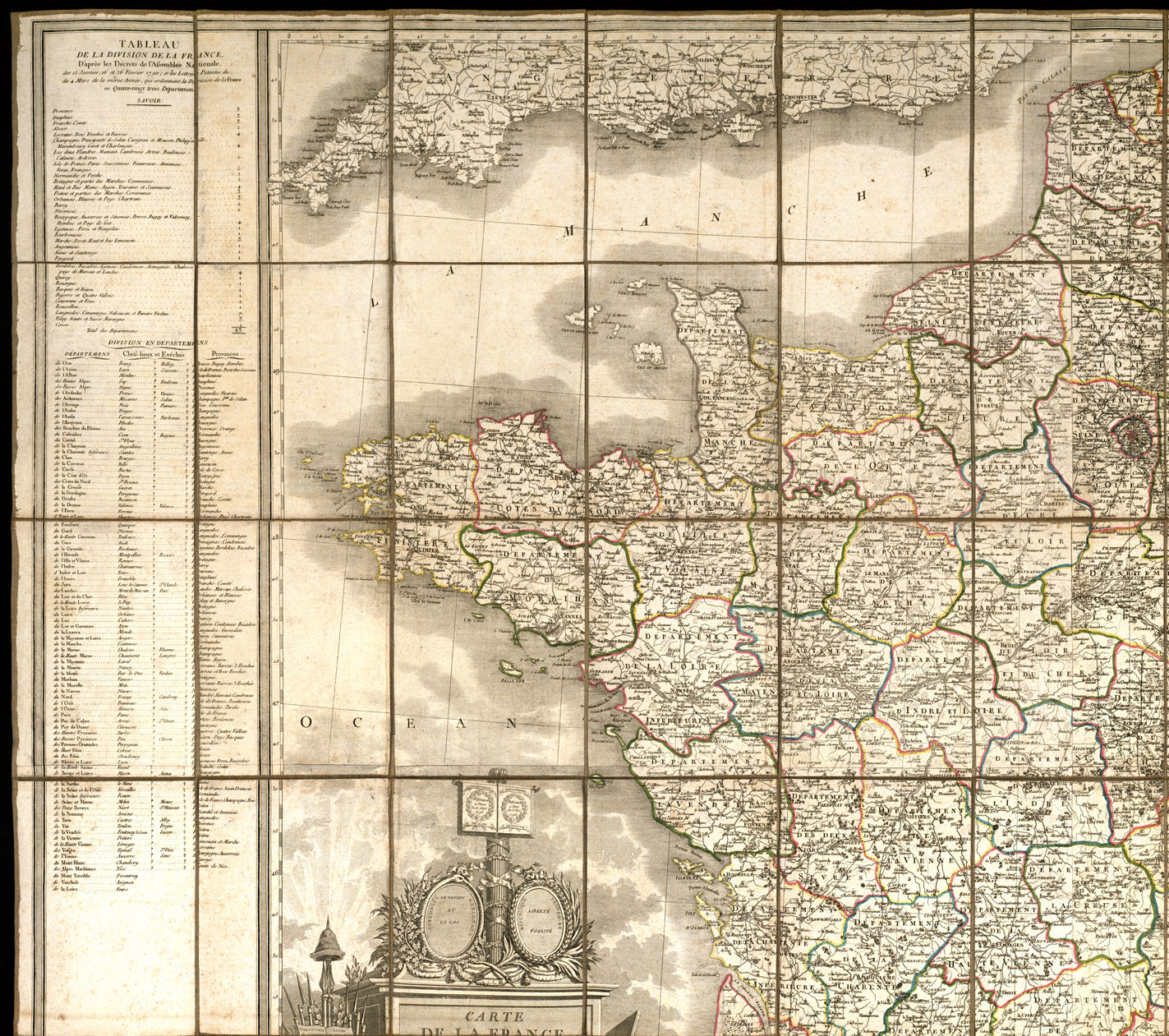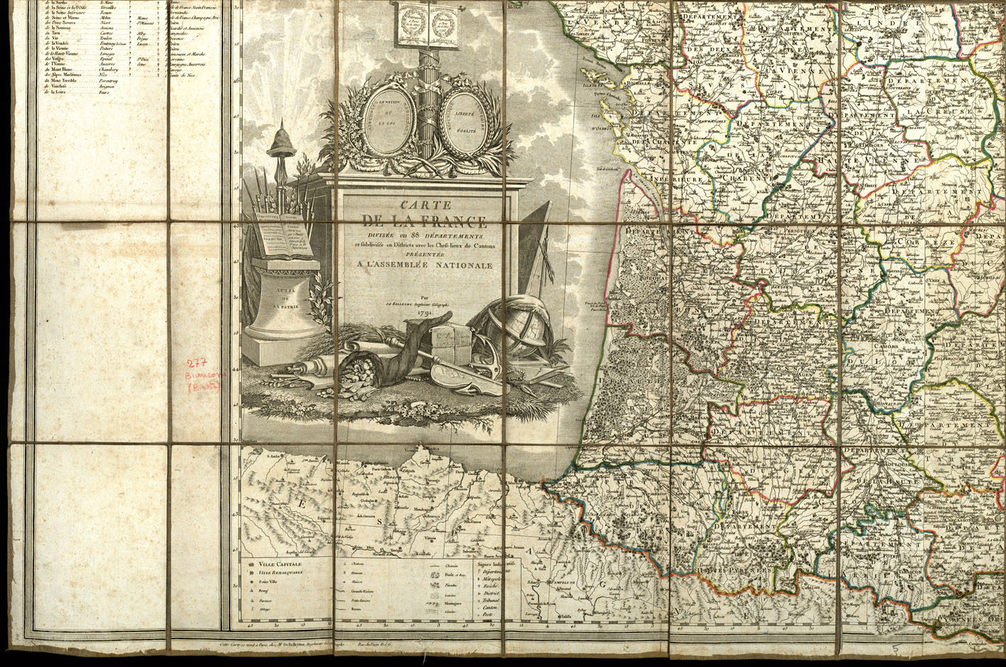 "Divisée en 88 Départements et subdivisée en districts avec les Chefs-lieux de Cantons, presentée à l'Assemblée Nationale, par De Balleyme ingenieur Géographe. Bellissima incisione su rame in 4 fogli riuniti su tela a stacchi. Esclusa la leggenda, che è nel lato ovest del disegno. Carta costruita in ordine al decreto 15 gennaio, 16 e 26 febbraio 1790, "et les Lettres Patents du 4 Mars de la meme année qui ordonnent la division de la France en Quatte-vingt trois Départements". L'incisione è stata eseguita da Barriére. Le longitudini provengano da Parigi. Con finissimo lavoro di bulino sono accennati a volo d'uccello i displuvi. I confini sono resi evidenti con coloritura applicata a mano. Sono segnate le grandi vie postali. Limiti-Nord: Passo di Calais - Sud: St. Clement (Spagna) - Est: Parma - Ovest: Santillana (Spagna). Contieme due scale grafiche in misure antiche, il rapporto è di circa 1:874.900."