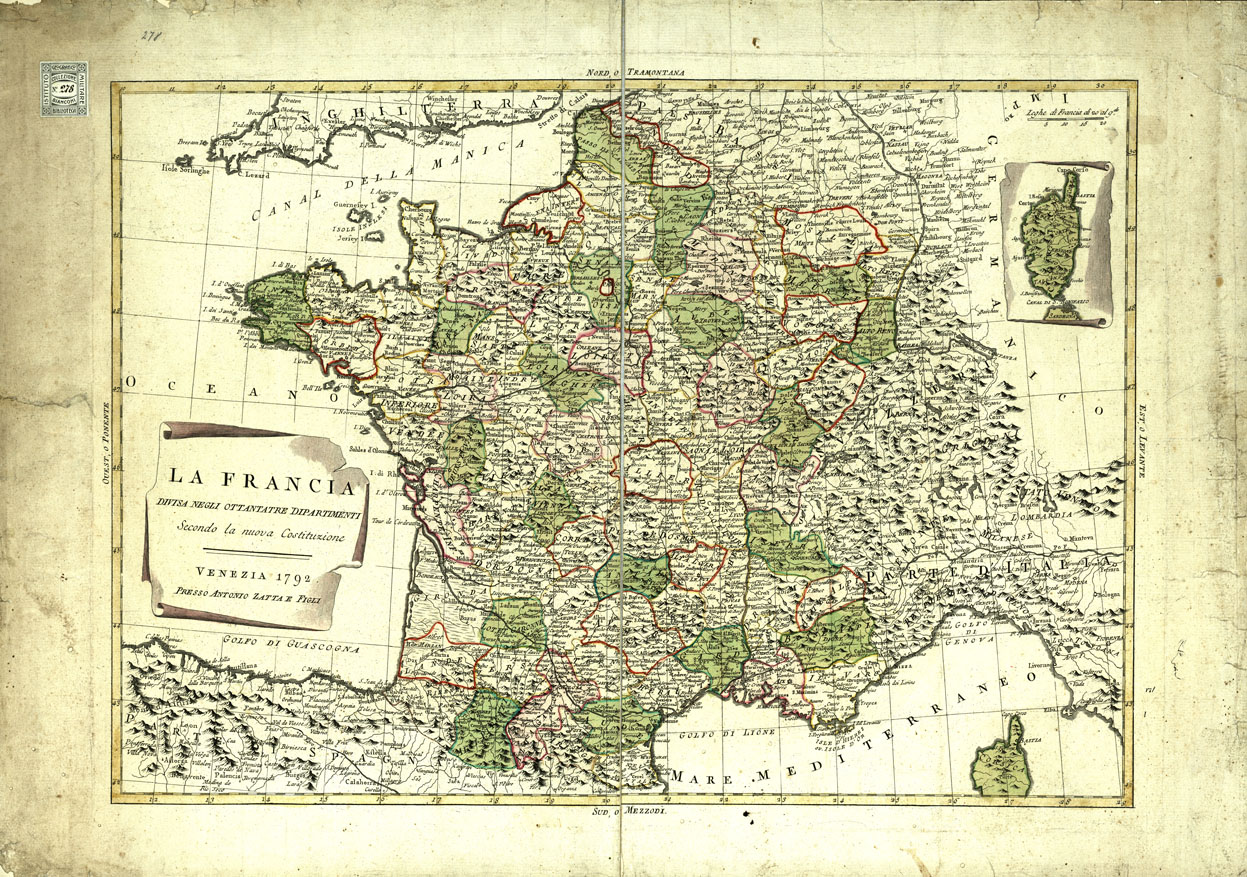 "Divisa negli ottantatre Dipartimenti - secondo la nuova Costituzione. Venezia, presso Antonio Zatta e figli. Carta copiata dal "Royaume de France" del geografo Janvier (Ved. n. 276 della stessa Collezione). Lo Zatta ha mantenuto la scala, la proiezione, l'origine delle longitudini ed il formato. Al posto della leggenda ha situata l'intera isola della Corsica ed estesi i paesi sulla sinistra del Reno. L'incisione dell'orografia è stata artisticamente migliorata. E' montata su tela."