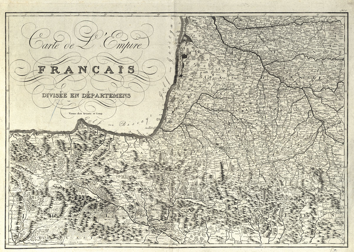 "Nach den Cassinischen Dreyecken und Karten mit der neuen Departements Eintheilung (Nuova Carta Generale della Francia) Wien-bey Artaria und Campanie. La carta è priva di data, da informazioni pervenute da Artaria risulta che è stata pubblicata nell'anno 1807. L'incisione su rame è dovuta ad J.W. Engelmann. Per la compilazione è stata presa per base la carta di Cassini. E' in nero all'infuori dei limiti dipartimentali che sono rappresentati da una linea a piccoli tratti ripassata a mano in color rosso, ed i confini di Stato pure ripassati in rosso od in bleu. E' composta di 6 fogli. Per quanto riguarda l'orografia sono rappresentate solo le catene montuose più importanti mediante i piccoli coni. Le zone boscose sono rappresentate da gruppi di alberelli. Nell'ultimo foglio è indicata la scala in 20 diverse misure antiche. Nei margini è la graduazione le longitudini provengano dall'isola del Ferro."