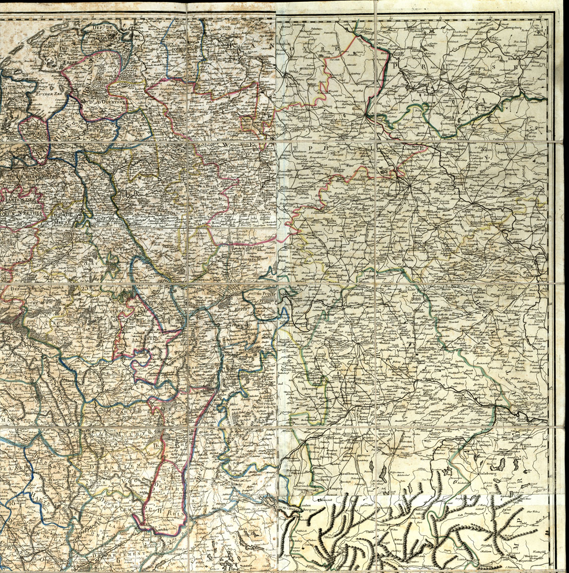 "Divisée en 115 Dèepartements, en arrondissements Communaux avec les Chefs Lieux de Cantone et en Divisions Militaires, comprenant aussi les Royaumes d'Italie, de Hollande de Baviere, de Westphalie, de Wurtemberg et tous les Etats de la Confédération du Rhin. Soumise aux derniéres observations par Bonise J.G. se vend à Paris, chez l'auteur, et chez Jean, rue Jean de Beauvais num.10 an 1809. Questa carta è un ingrandimento di quella costruita dall'Ing.Poirson nel 1798 ed esaminata al num. 279 dalla Collezione Bianconi. E' stata aumentata la scala portandone il rapporto approssimativo da 1:949.000 ad 1:1:033.000 circa, ed è stata estesa di territorio per comprendere le terre ed i paesi citati nel titolo. Sono embrionalmente segnati i displuvi, migliore è il disegno dell'idrografia. I confini sono colorati con acquerello. Le longitudini provengano dall'isola del Ferro. In separata tabella è contenuto, a scale minori, il Regno d'Italia e la Corsica."