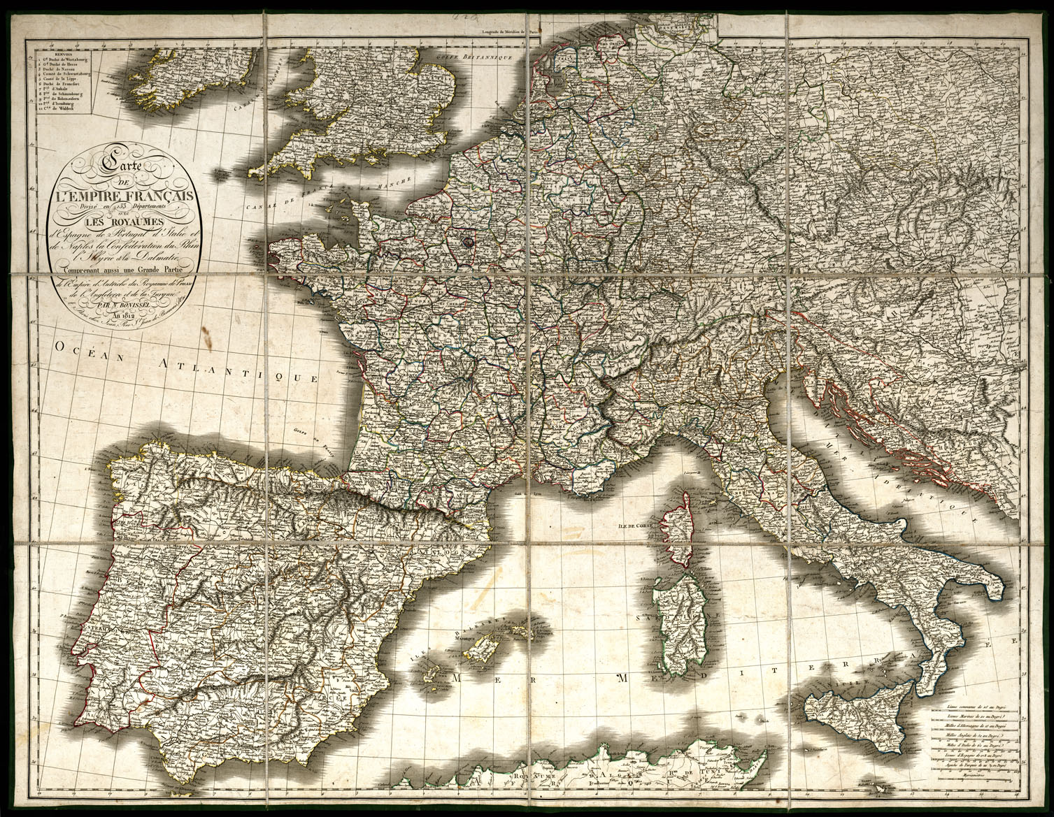 "Divisée in 133 Déepartements, avec les Royaumes d'Espagne, de Portugal, d'Italie et de Naples, la Confédération du Rhin, l'Illyrie, et la Dalmatie. Comprenant aussi une grande partie de l'Empire d'Autriche, du Royaume de Prusse, de l'Angleterre et de la Turquie. Par Bonissel, an 1812, à Paris chez Jean, Rue St. Jean de Beauvais, N. 10. Buona incisione in rame in un solo foglio montato su tela a stacchi. Le longitudini sono riferite al meridiano di Parigi, la proiezione è conica. Contiene 8 scale grafiche, il rapporto è di 1:2.759.000 circa. I confini sono colorati con acquerello. L'orografia è prospettica e evidente nelle catene principali. Scarsa è la viabilità e poco esatta, eccettuate le principali arterie."