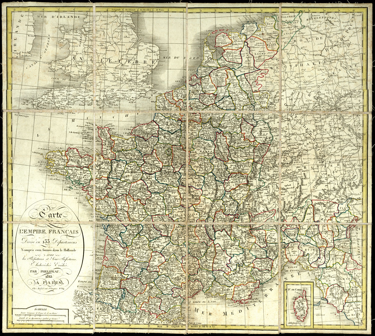 "Divisée en 133 Départements y compris ceux formés dans la Hollande, avec les Préfectures et sous Préfectures, Archevechés, Evechés, par Phelipeau, 1812 ° Paris, chez Basset rue St. Jacques N. 64. L'autore ha copiata questa carta da quella dell'Ing. Poirçon del 1802 aumentandone la superficie per comprendere i nuovi compartimenti a nord, mediante una striscia incollata di cm. 15x72. Il rame nuovo è stato poi esteso fino alle Bocche del Po nell'Adriatico. Le principali catene figurano a volo d'uccello. E' stata mantenuta la scala di 1:2.096.000 circa ed il reticolato, le cui longitudini provengano dall'isola del Ferro. La copia posseduta è montata su tela a stacchi. Nel margine inferiore del foglio è riprodotta separatamente la Corsica."